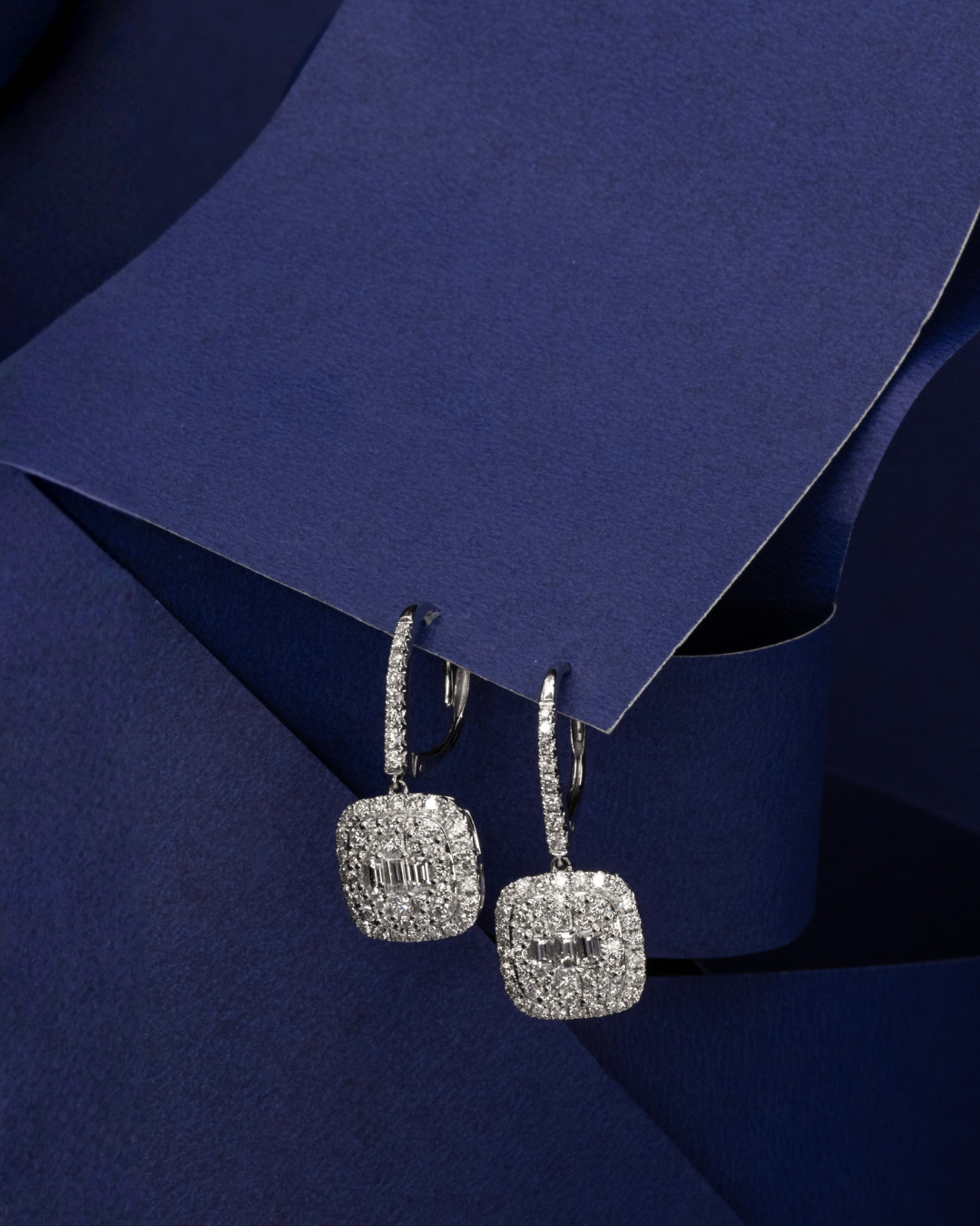 مصنوعة ببراعة من 6.44 غرام من الذهب الأبيض عيار 18، تجمع هذه الأقراط بين عدة قصّات للماس لتشكل تصميمًا راقيًا ومتألقًا. يبرز الترتيب المدروس للماس بقصّات باغيت، برنسيس، ودائرية البريق ويضيف أبعادًا أنيقة للقطعة.
