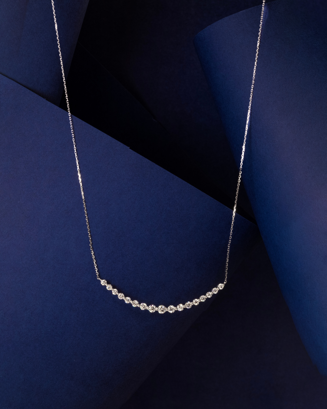 مصنوع من 2.6 غرام من الذهب الأبيض عيار 18، يتميز هذا العقد الأنيق بسبع عشرة ماسة مستديرة تتألق ببريق راقٍ. يخلق ترتيب الأحجار بعناية لمعانًا فاخرًا يعزز التصميم المتقن للقطعة.