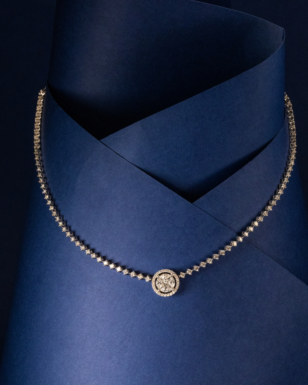 مصممة من 13.3 غرام من الذهب الأبيض عيار 18 قيراط، تتميز هذه القلادة الفاخرة بـ 109 أحجار ماس دائرية تتلألأ ببريق استثنائي. ترتيب الأحجار بدقة يخلق عرضًا فاخرًا للضوء يعزز التصميم المتقن والأنيق للقلادة.