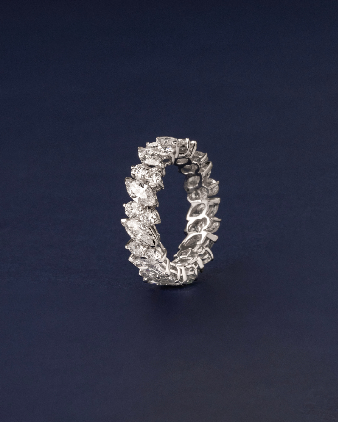 Crafted in 3.73 grams of 18K white gold, this size 54 ring exudes elegance and brilliance. Featuring eleven marquise-cut diamonds totaling 2.51 carats, the design showcases elongated sparkle and refined sophistication. Complementing them, twenty-two round-cut diamonds totaling 1.83 carats enhance the piece with radiant shimmer and a harmonious interplay of light. All diamonds are carefully selected for VVS2–VS1 clarity and GH color, ensuring a crisp, dazzling brilliance from every angle.