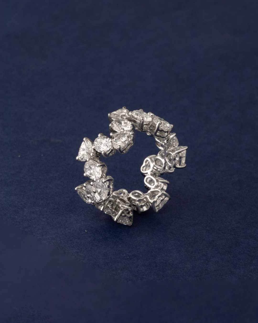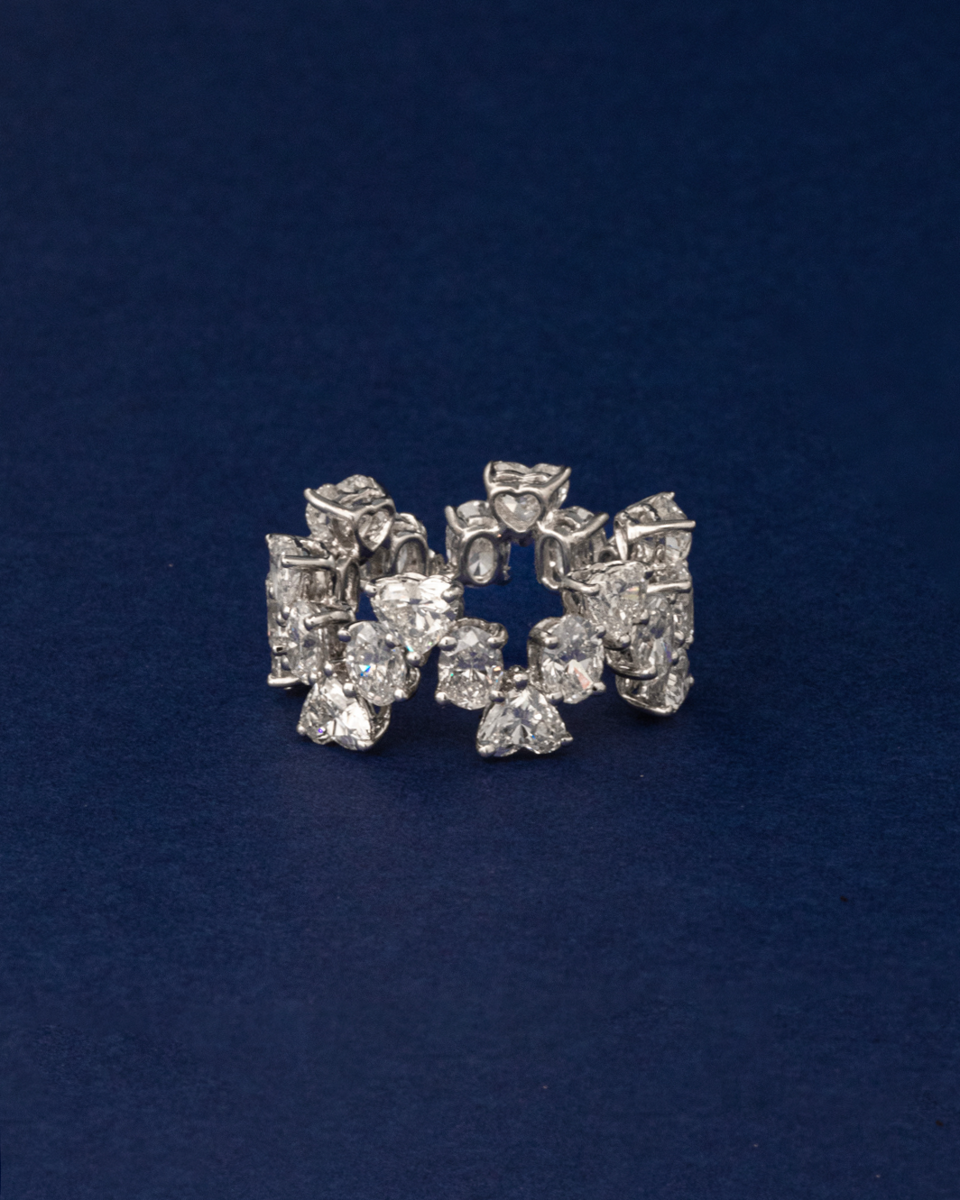 مصنوع من 4.49 غرام من الذهب الأبيض عيار 18، صُمم هذا الخاتم بمقاس 51 ليجسد الأناقة والرقي الرومانسي. يضم التصميم اثنتي عشرة ماسة بقصّة بيضاوية بإجمالي 3.72 قيراط، إلى جانب اثنتي عشرة ماسة بقصّة قلب بإجمالي 3.73 قيراط، لتخلق القطعة تفاعلًا رائعًا بين الأشكال والبريق. تم اختيار كل ماسة بعناية لنقاء VS1 ولون GH، مما يضمن لمعانًا استثنائيًا ولمسة متألقة وراقية تكمل جمال شريط الذهب الأبيض الأنيق.