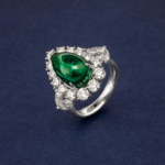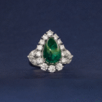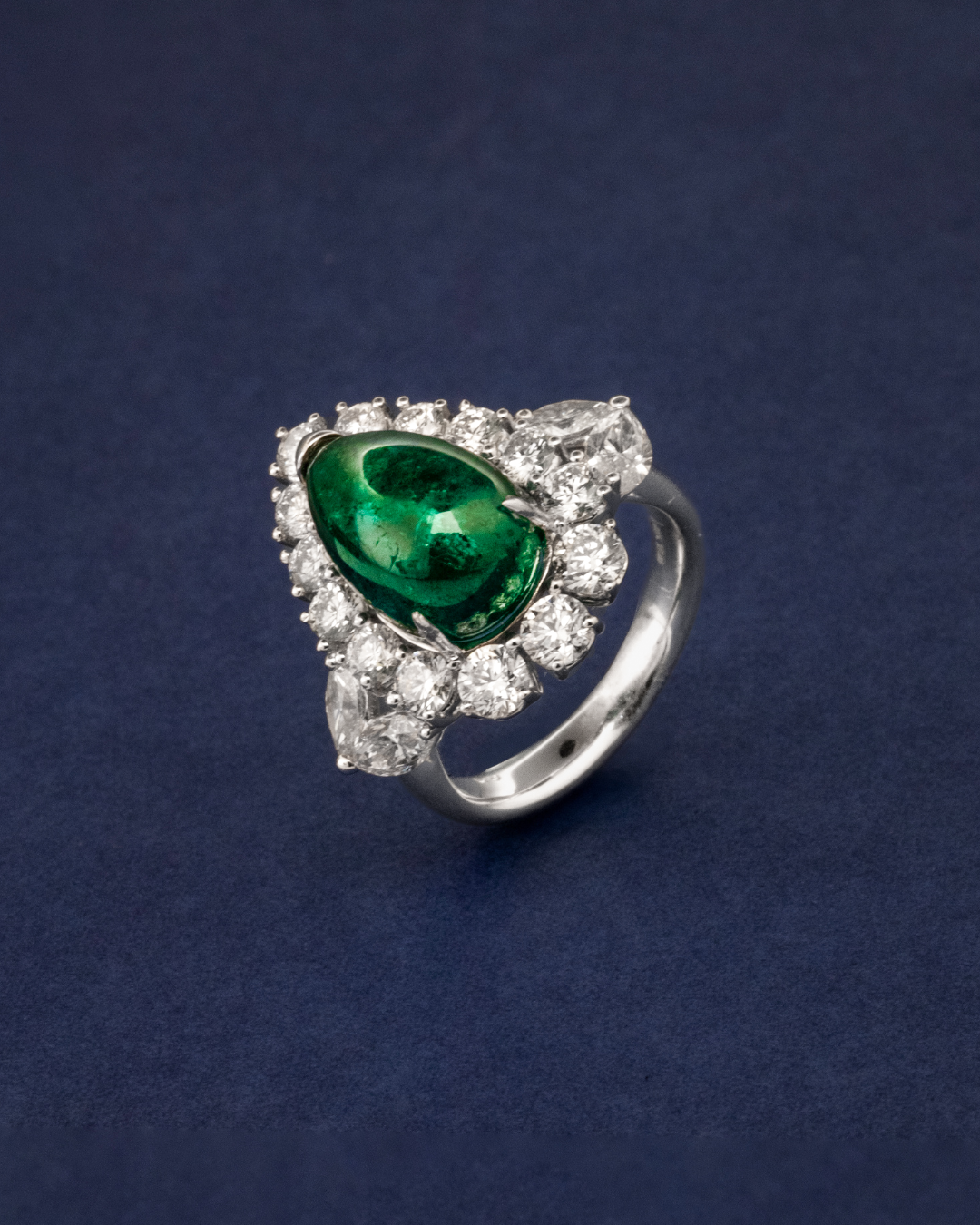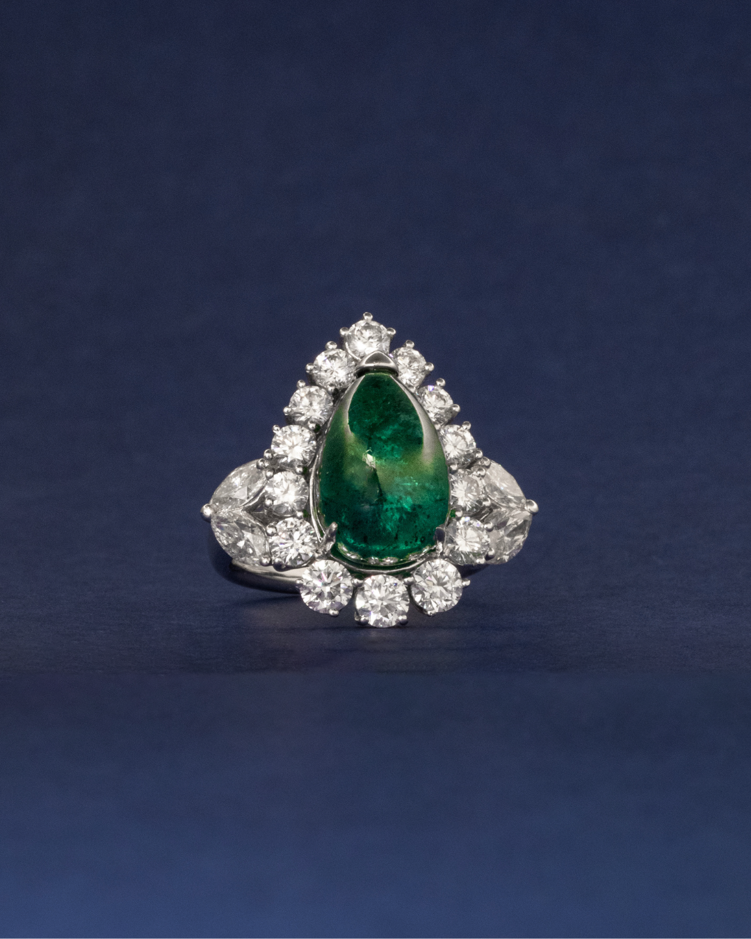مصمم من 7.45 غرام من الذهب الأبيض عيار 18 ويأتي بمقاس 54، يحتفل هذا الخاتم الرائع بالأناقة واللون ببراعة فائقة. الحجر المركزي، زمرد أخضر مذهل بشكل دمعة ويزن 9.45 قيراط، ينبض بالعمق والحيوية والأناقة. تحيط به هالة من 18 حجر ماس دائري بإجمالي 3.195 قيراط، بما في ذلك 9 أحجار بإجمالي 1.09 قيراط، حجرتان بإجمالي 0.3 قيراط، 3 أحجار بإجمالي 0.71 قيراط، و4 أحجار بإجمالي 1.095 قيراط، لتشكّل هالة من البريق المتلألئ. تم اختيار كل حجر ماس بعناية فائقة لضمان نقاء VVS2–VS1 ولون GH، مما يضفي لمعانًا استثنائيًا يكمل لون الزمرد الأخضر الغني بشكل مثالي.