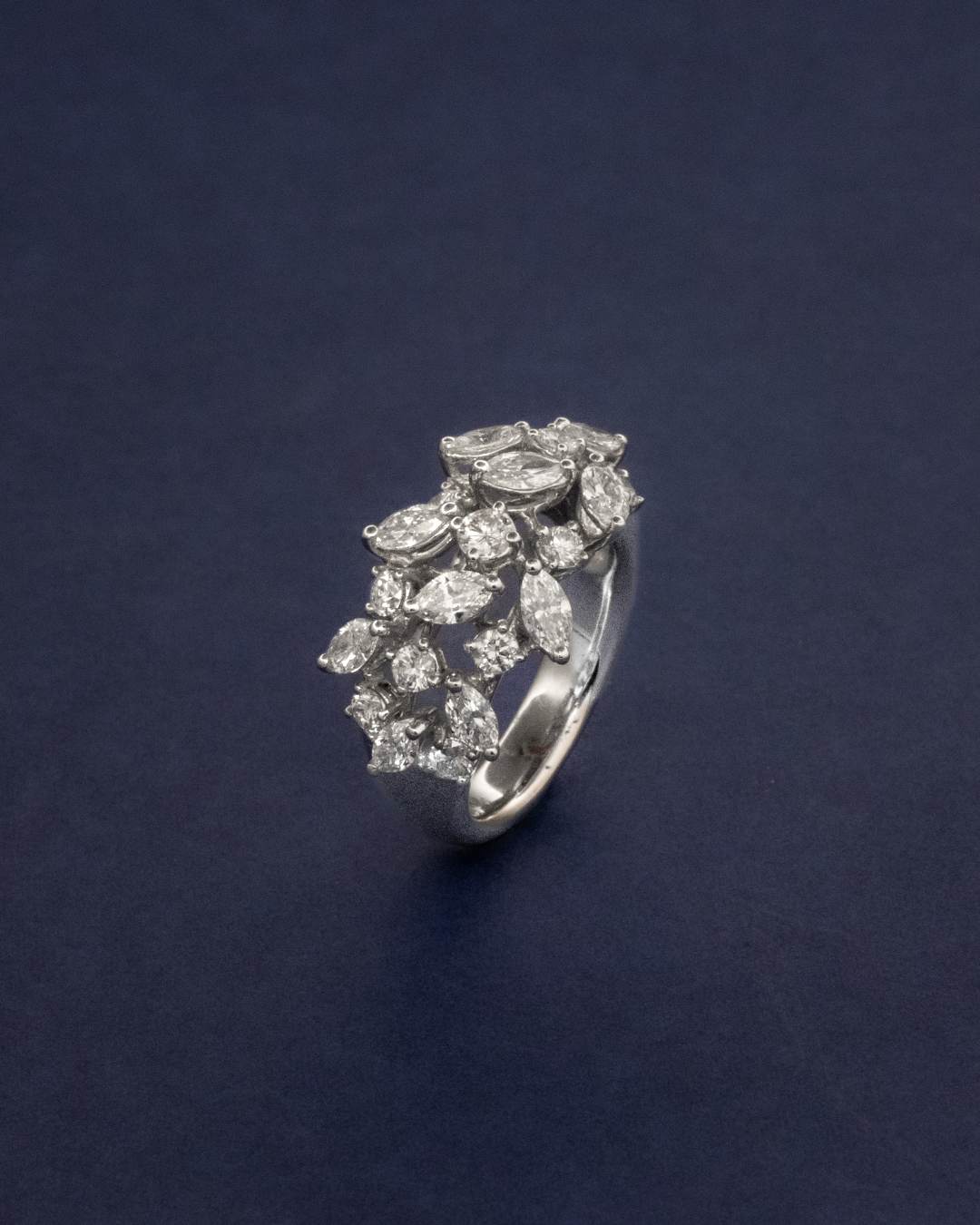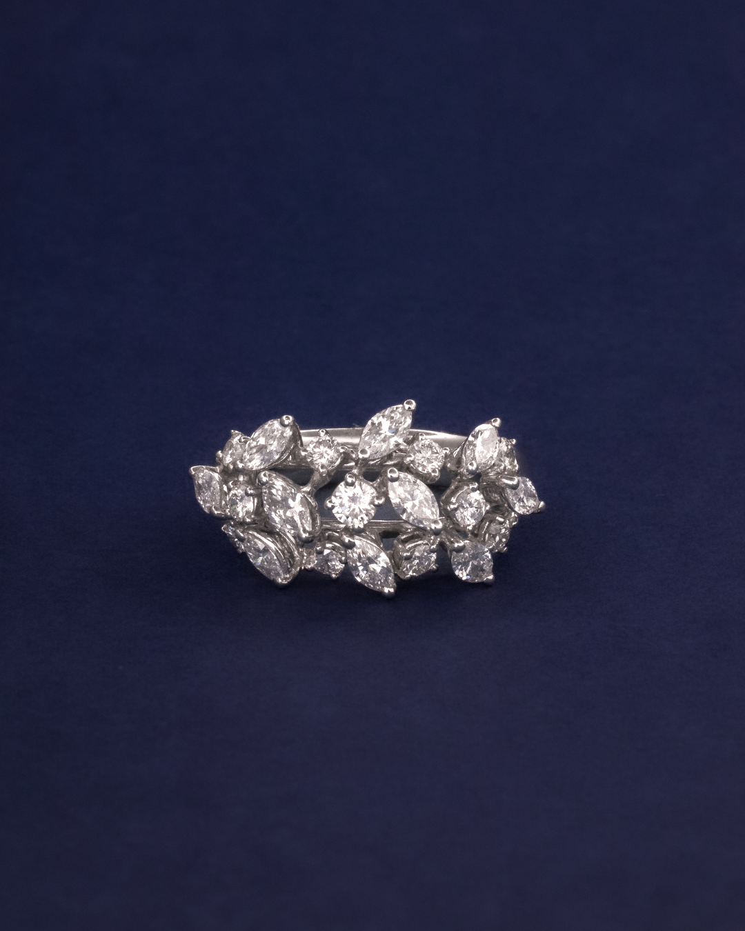 يخلق التناسق بين الماسات الماركيز الممدودة وبريق الماسات المستديرة الناعم تصميمًا لافتًا — متوازنًا، مضيئًا، ومفعمًا بالفخامة. قطعة خالدة تُضفي على كل إطلالة لمسة من التألق الراقي.