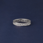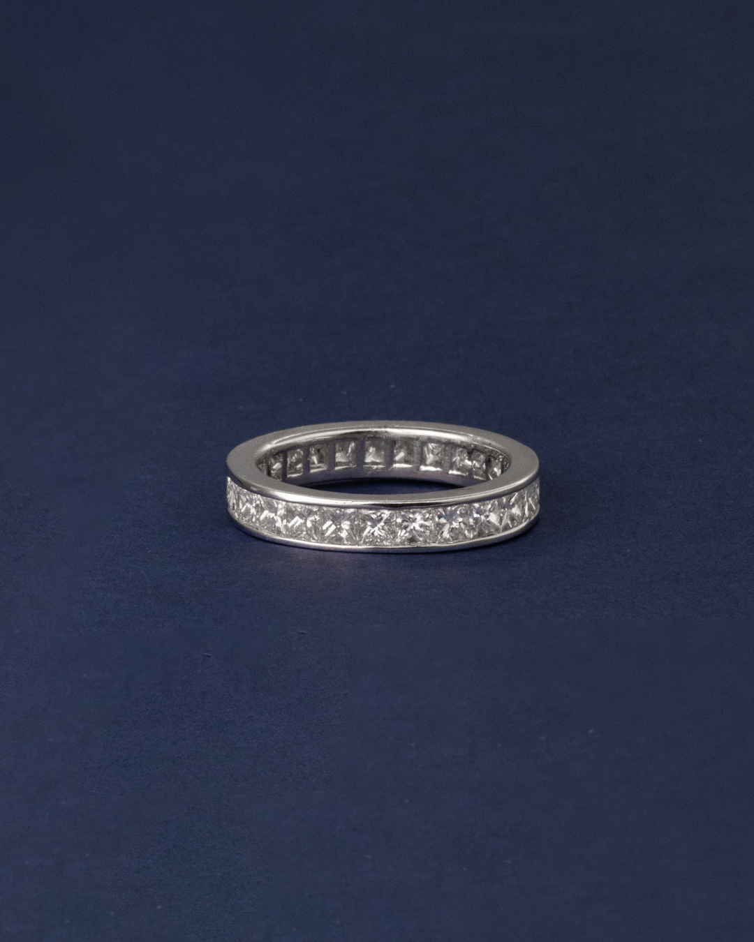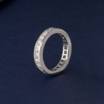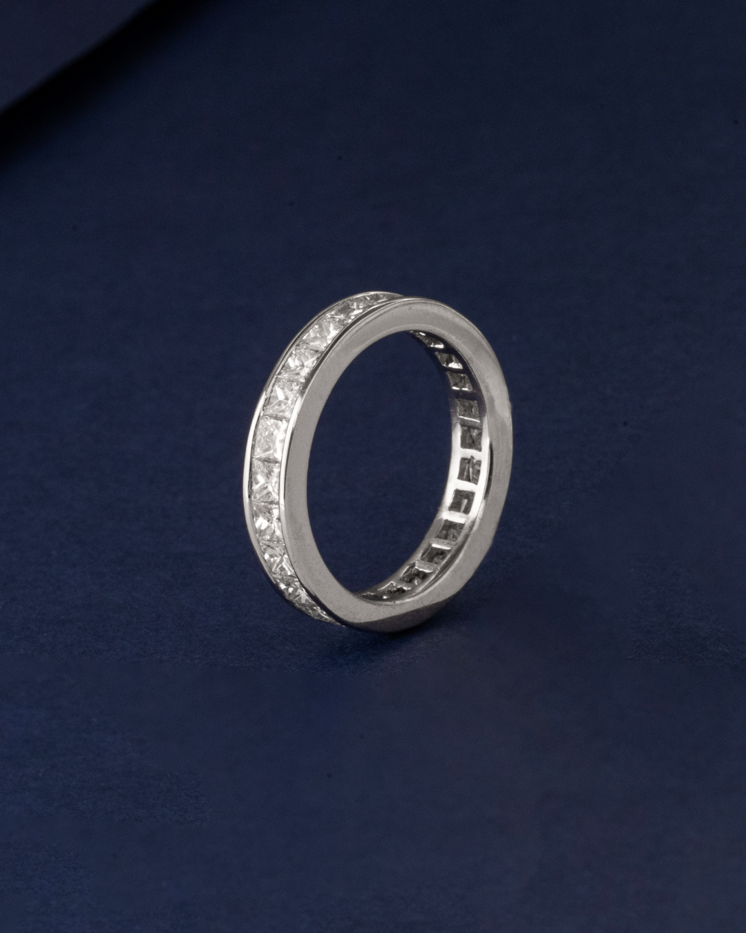 يمنح صفّ متكامل من ألماس البرنسيس عالي النقاء بريقًا هندسيًا متألّقًا، ليضفي على الخاتم لمسة عصرية بطابع معماري راقٍ. بتصميمه الانسيابي ولمعانه الأخّاذ، يُعد هذا الخاتم قطعة فاخرة تلفت الأنظار مع كل حركة.