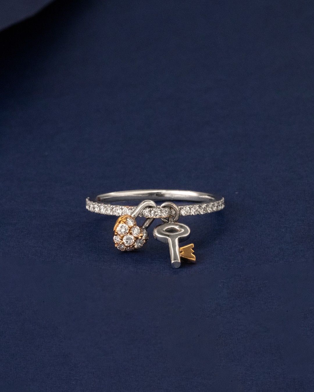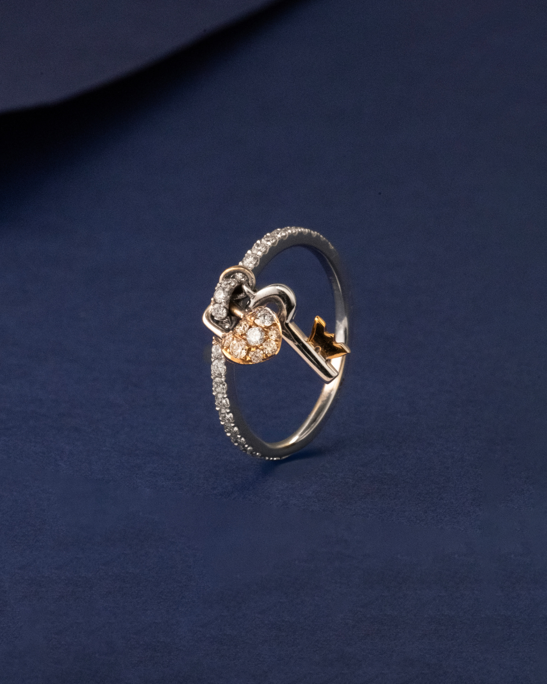 مزيج دقيق من الذهب الوردي الدافئ والذهب الأبيض المتلألئ، مع لمسات من الألماس البراق — يقدم هذا الخاتم سحرًا عصريًا وخلودًا في الوقت نفسه، مثالي للأناقة اليومية أو المناسبات الخاصة.