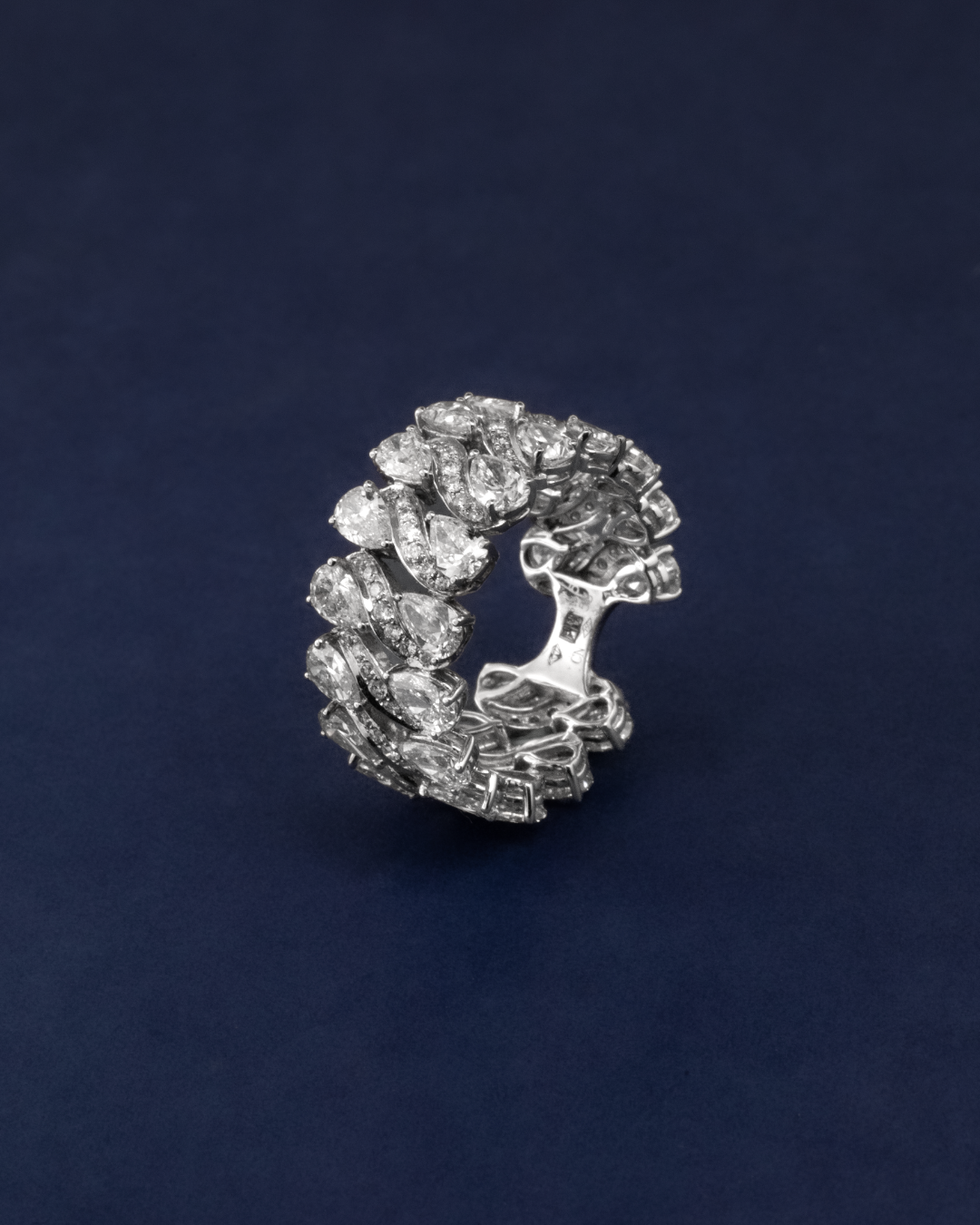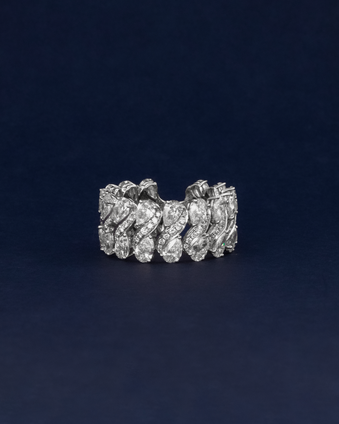 تشكل الألماسات الكمثرية الرشيقة نقاط التركيز في التصميم، مكملة بهالة دقيقة من الألماسات الدائرية التي تعزز تألقها. يمثل هذا الخاتم بيانًا من الرقي المتقن ويجذب الأنظار من كل زاوية وكل حركة.