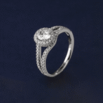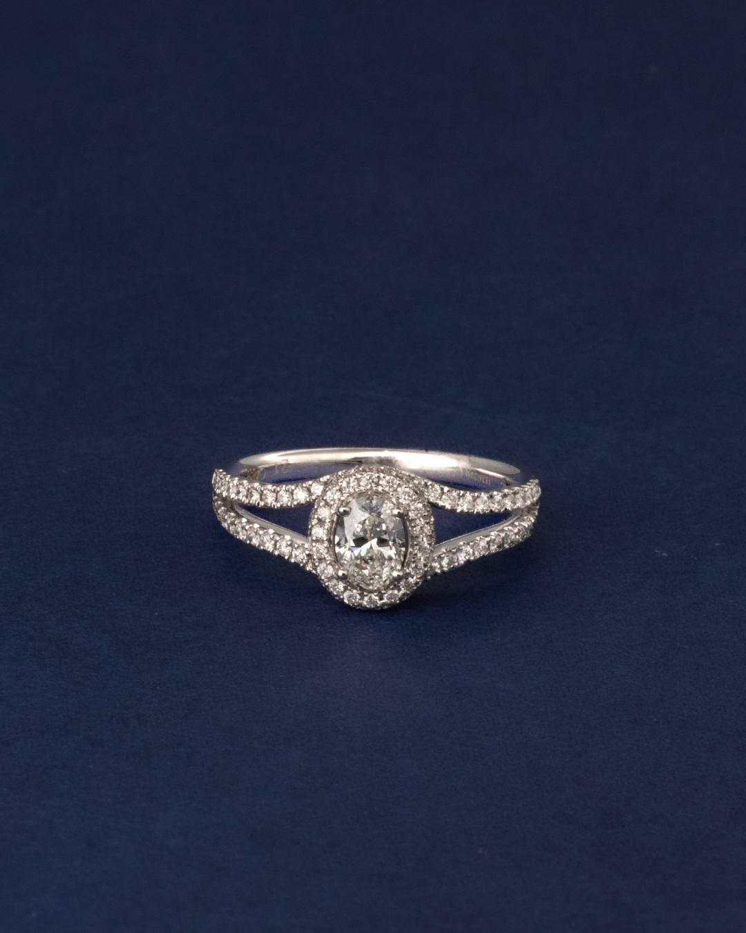 تشكّل الماسة البيضاوية المتألقة النقطة المحورية للخاتم، محاطة بهالة من الماسات المستديرة المرصوصة بدقة، لتخلق لمعانًا متواصلًا وتصميمًا أنيقًا بكل بساطة، يعكس الفخامة والرقي.
