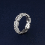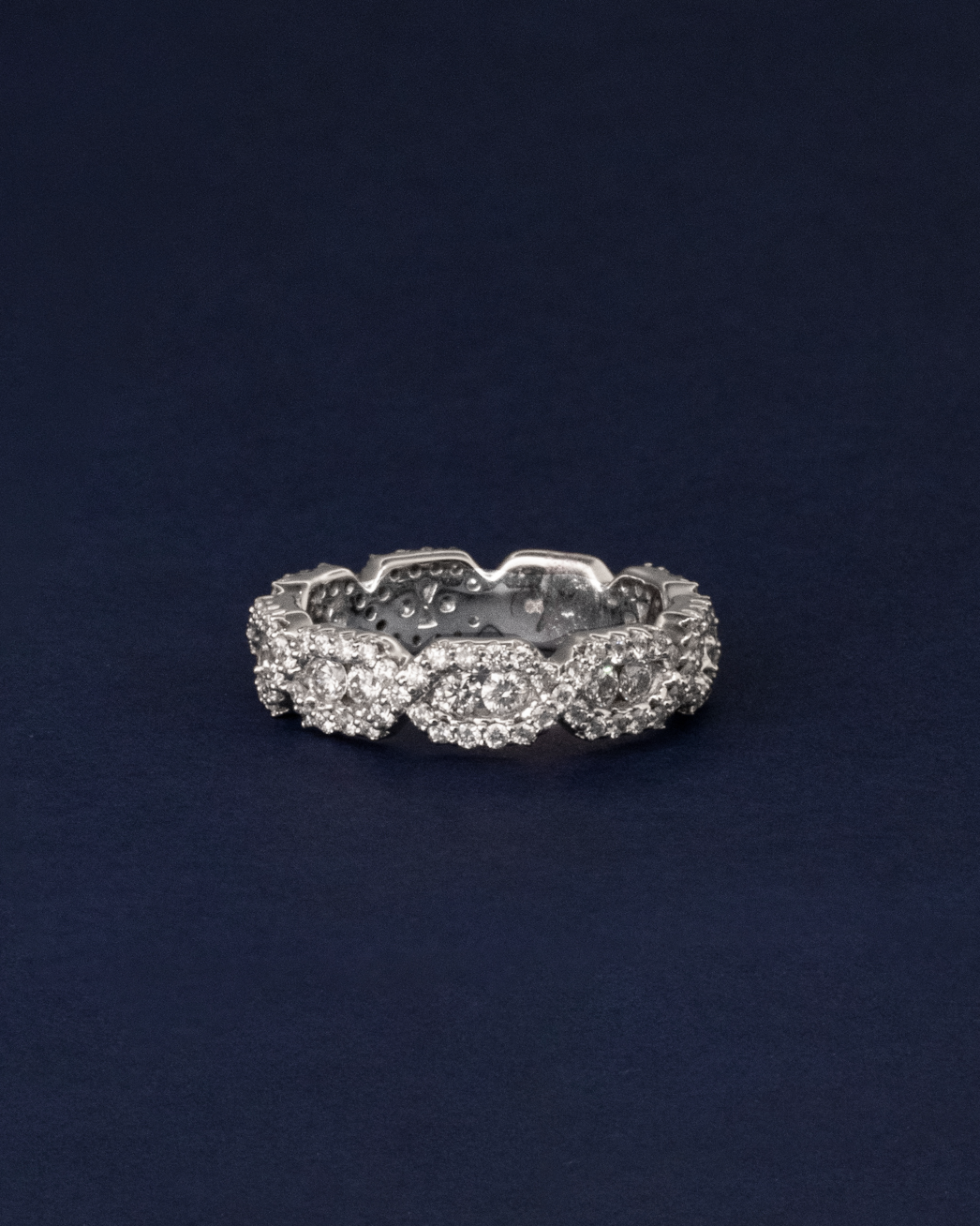 The meticulously set round-cut diamonds create a continuous shimmer around the band, enhancing the ring’s elegant design and delivering timeless brilliance for any occasion.