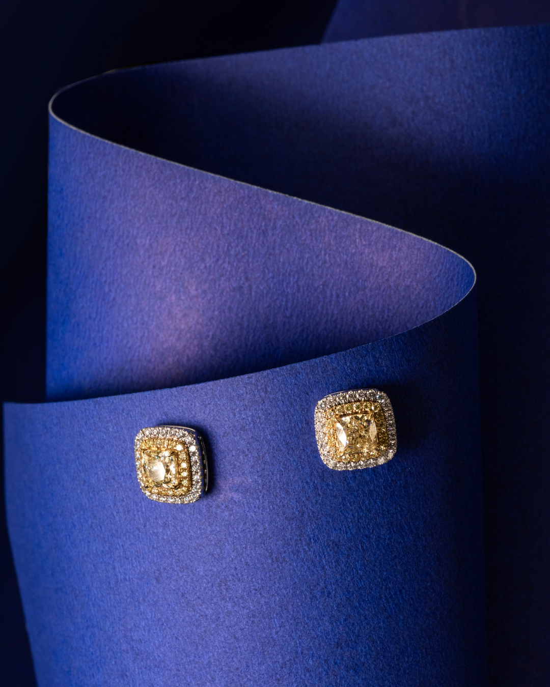 مصنوعة من الذهب الأبيض والأصفر عيار 18 ويزن الزوج 3.65 غرام، تجمع هذه الأقراط بين دفء ماس أصفر فاخر وبريق ماس أبيض كلاسيكي. تم اختيار كل حجر بعناية وتركيبه لإضفاء توازن متناغم بين اللون والبريق، مما ينتج تصميمًا أنيقًا وجذابًا.