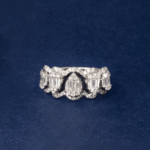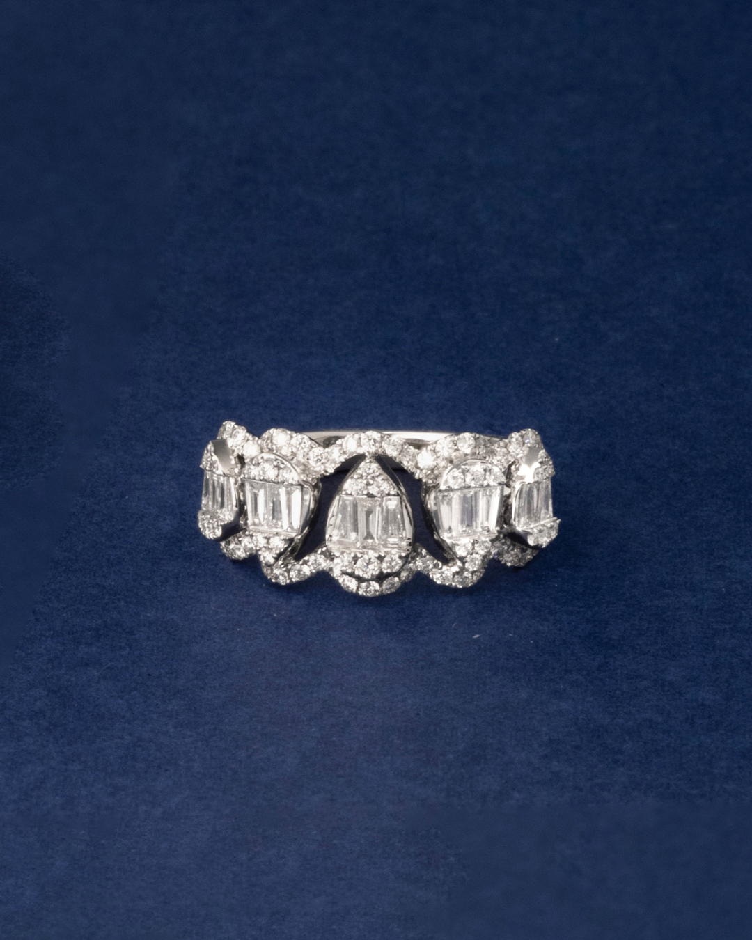 Crafted in 4.72 grams of 18K white gold, this size 56 ring radiates refined brilliance and timeless sophistication. Seventy-six round-cut diamonds, totaling 0.54 carats, pair beautifully with fifteen baguette-cut diamonds totaling 0.41 carats—each selected for exceptional VS1 clarity and GH color. The interplay of round sparkle and sleek baguette geometry creates a balanced, luminous design that catches the light from every angle.