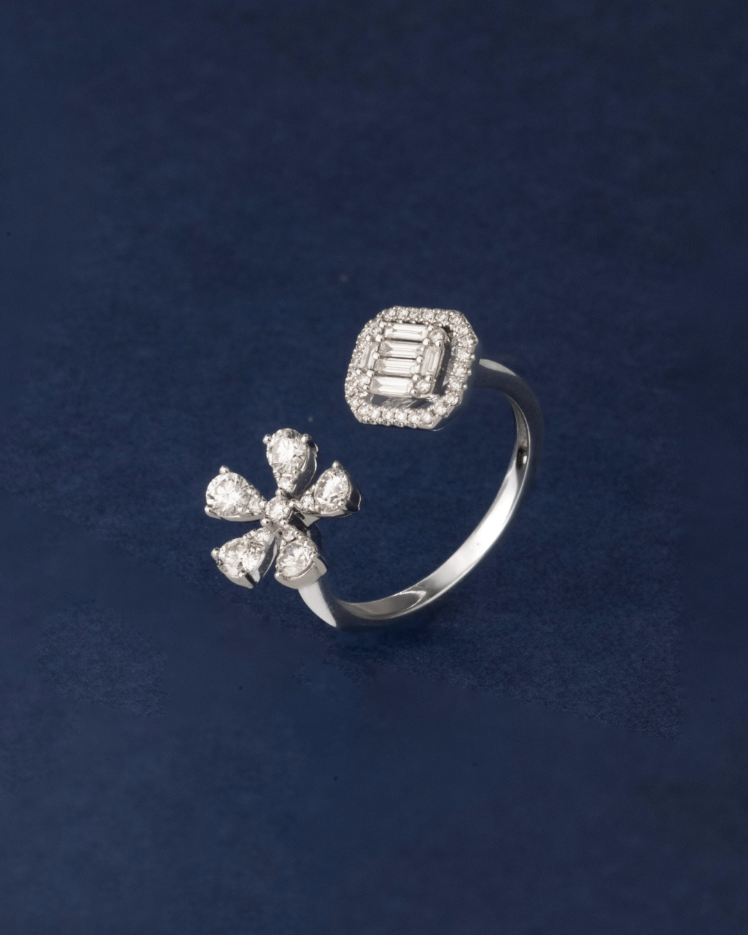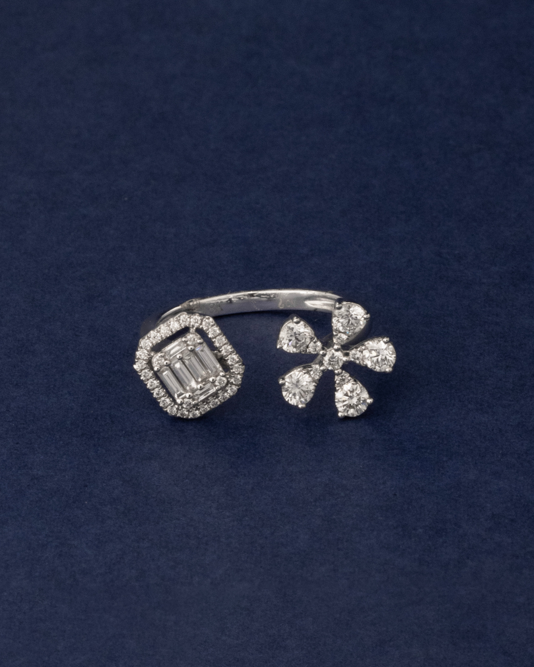 Crafted in 3.36 grams of 18K white gold, this size 53 ring showcases a refined harmony of brilliance and modern structure. Forty-one round-cut diamonds, totaling 0.57 carats, create a radiant foundation of sparkle, complemented by six sleek baguette-cut diamonds totaling 0.12 carats. Each diamond is selected for exceptional VS1 clarity and GH color, ensuring a crisp, luminous finish that enhances the ring’s sophisticated silhouette.