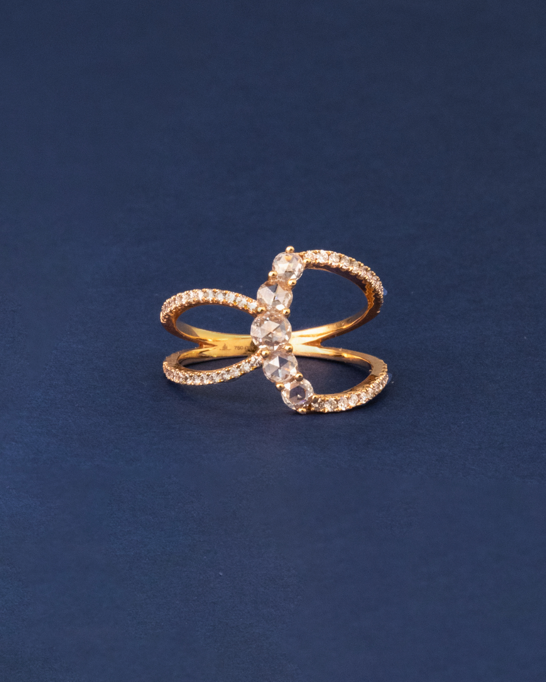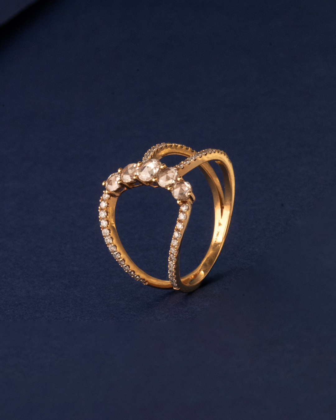 Crafted in 2.75 grams of 18K rose gold, this ring combines delicate elegance with intricate brilliance. Fifty-two round-cut diamonds, totaling 0.297 carats, form a shimmering foundation, while five rose-cut diamonds totaling 0.49 carats add vintage-inspired charm and a soft, romantic glow. Each diamond is selected for SI1 clarity and GH color, ensuring a harmonious sparkle that beautifully complements the warm hue of the rose gold.