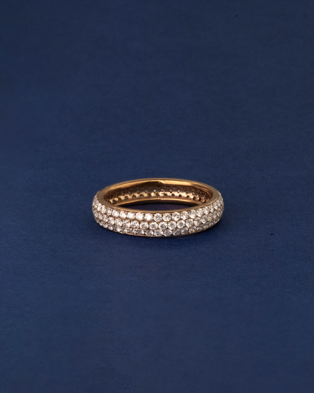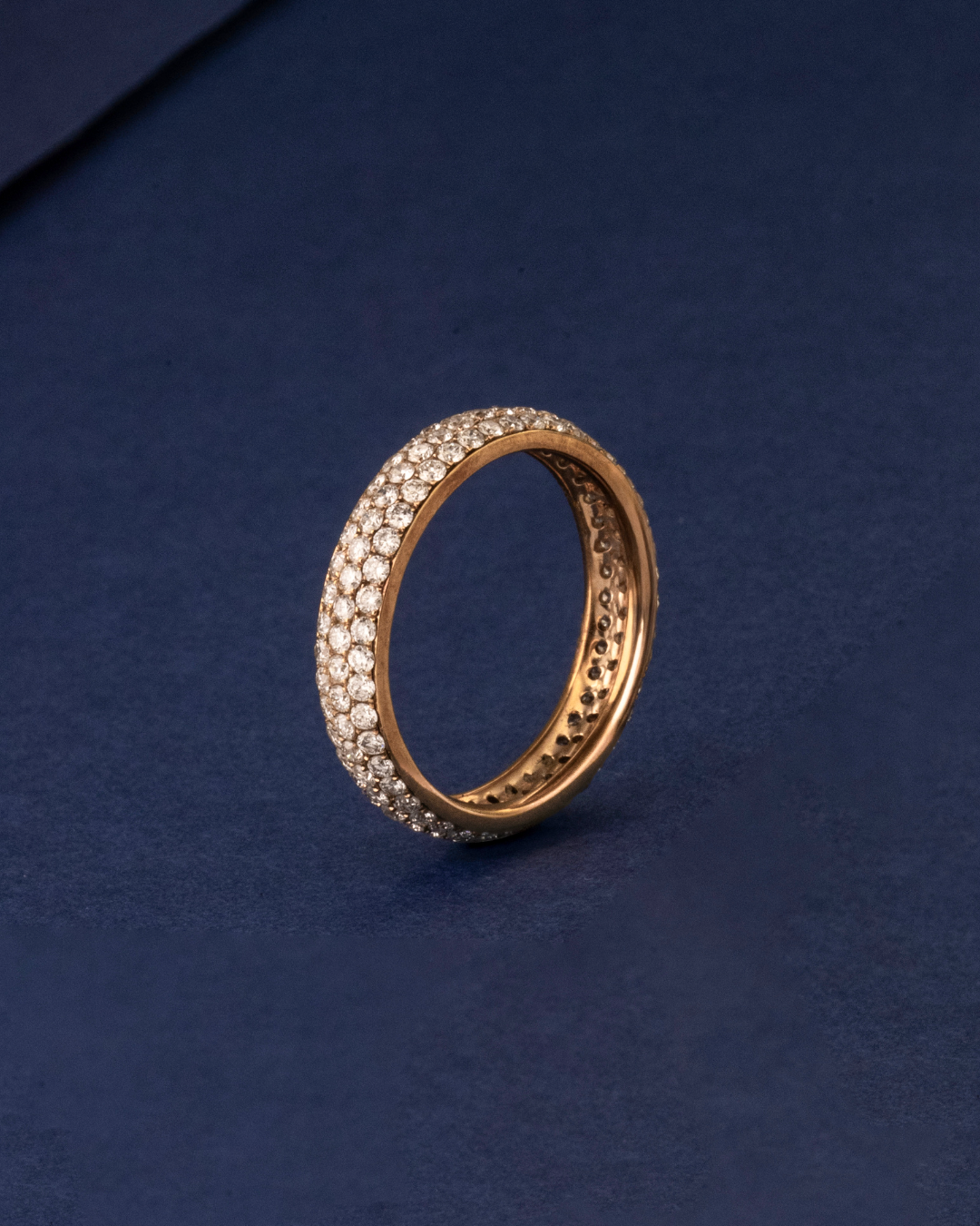 Crafted in 3.81 grams of 18K yellow gold, this size 58 ring radiates timeless elegance and refined brilliance. Featuring 132 round-cut diamonds totaling 3.81 carats, the design sparkles with a continuous display of light from every angle. Each diamond is carefully selected for VS2 clarity and GH color, ensuring a harmonious and luminous finish that complements the warm glow of the yellow gold band.