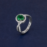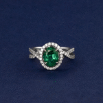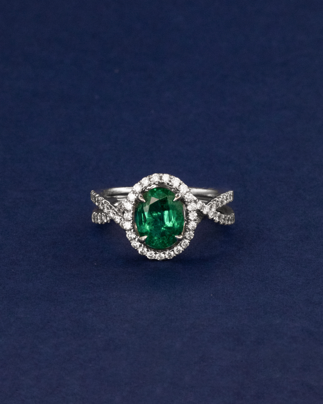 Crafted in 5.92 grams of 18K white gold, this size 56 ring exudes elegance and vibrant sophistication. Seventy-four round-cut diamonds totaling 0.7 carats form a sparkling halo, beautifully highlighting the centerpiece—a striking oval green emerald of 1.84 carats. Each diamond is selected for VS1 clarity and GH color, ensuring a brilliant, luminous shimmer that enhances the rich hue of the emerald.