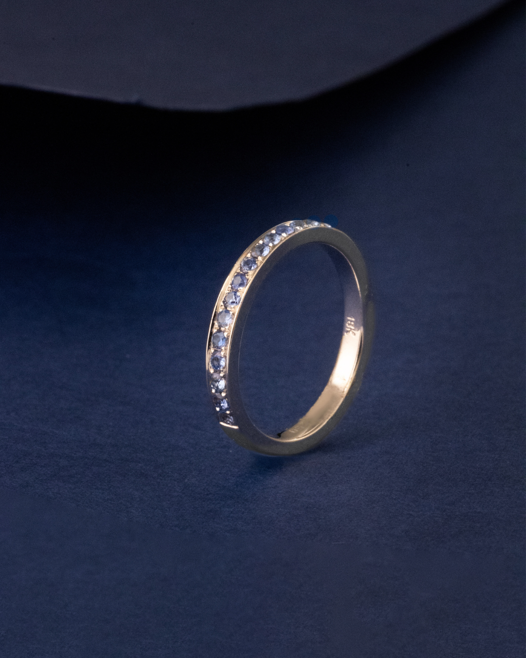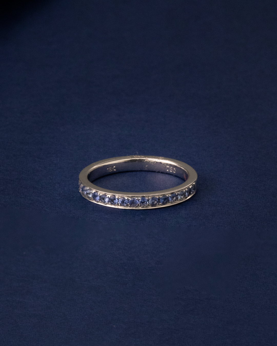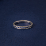 Crafted in 3.37 grams of 18K white gold, this size 54 ring exudes timeless sophistication and subtle elegance. Fifteen round-cut blue sapphires, totaling 0.32 carats, are meticulously set to create a delicate yet captivating sparkle. The deep blue hue of the sapphires beautifully contrasts with the polished white gold band, enhancing the ring’s refined and versatile design.