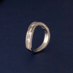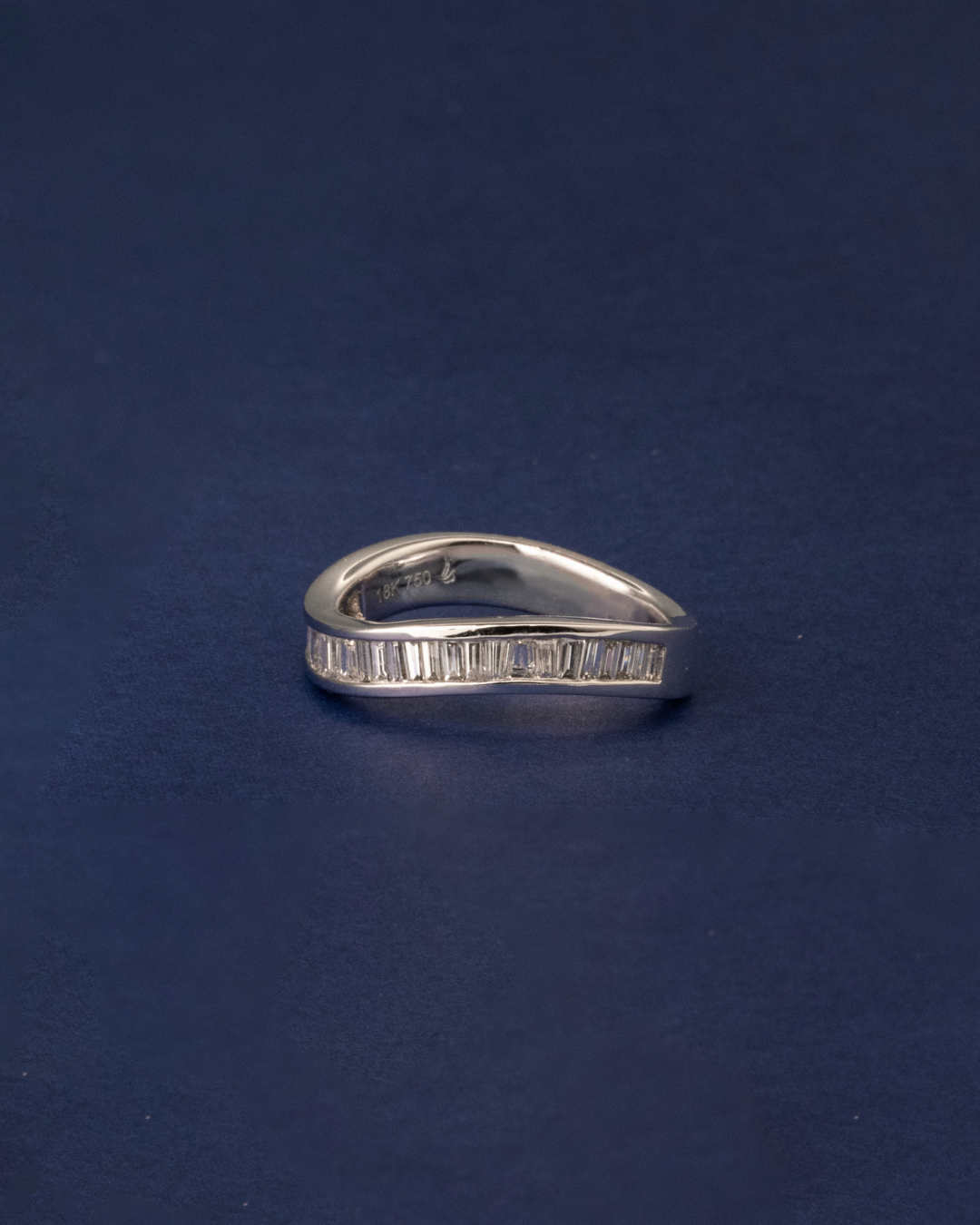Crafted in 5.72 grams of 18K white gold, this size 56 ring exudes refined elegance and contemporary sophistication. Featuring twenty-four tapered-cut diamonds totaling 0.78 carats, complemented by three additional tapered-cut diamonds totaling 0.08 carats, the design creates a harmonious and radiant display of light. Each diamond is selected for VS1 clarity and GH color, ensuring a crisp, luminous sparkle that beautifully enhances the sleek white gold band.