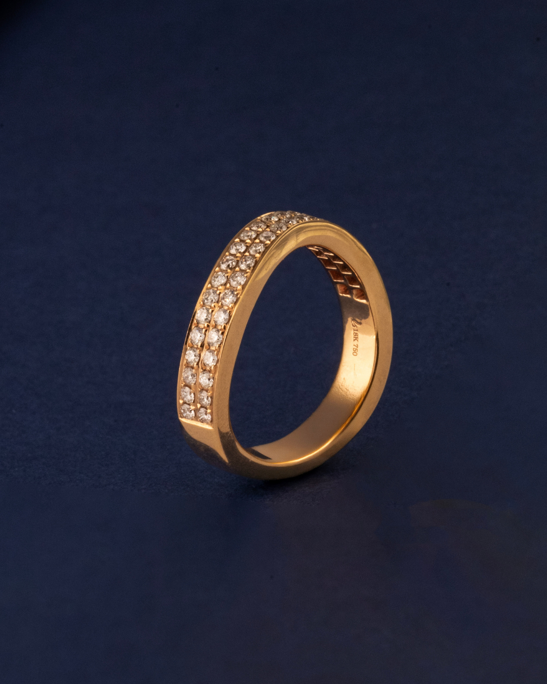 Crafted in 7.5 grams of 18K rose gold, this size 56 ring radiates warm sophistication and refined sparkle. Forty-two round-cut diamonds totaling 0.56 carats are meticulously set to create a dazzling display of brilliance. Each diamond is selected for VS–SI clarity and GH color, ensuring a luminous and harmonious shimmer that beautifully complements the soft glow of the rose gold band.