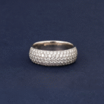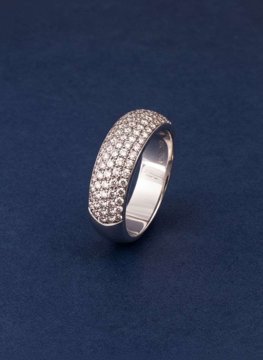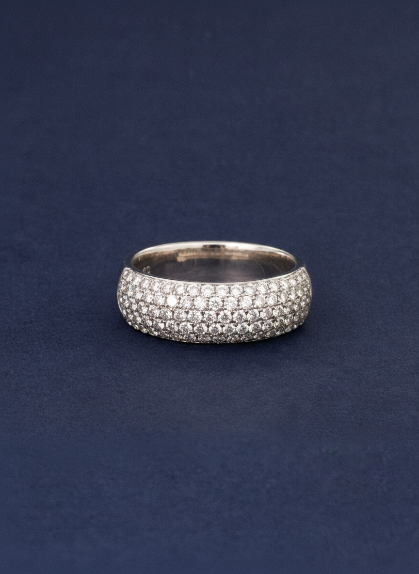Crafted in 6.78 grams of 18K white gold, this size 56 ring exudes timeless sophistication and sparkling brilliance. Featuring 89 round-cut diamonds totaling 1.08 carats, the design creates a radiant display of light that catches the eye from every angle. Each diamond is carefully selected for VS1 clarity and H color, ensuring a crisp, luminous sparkle that enhances the refined white gold band.