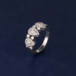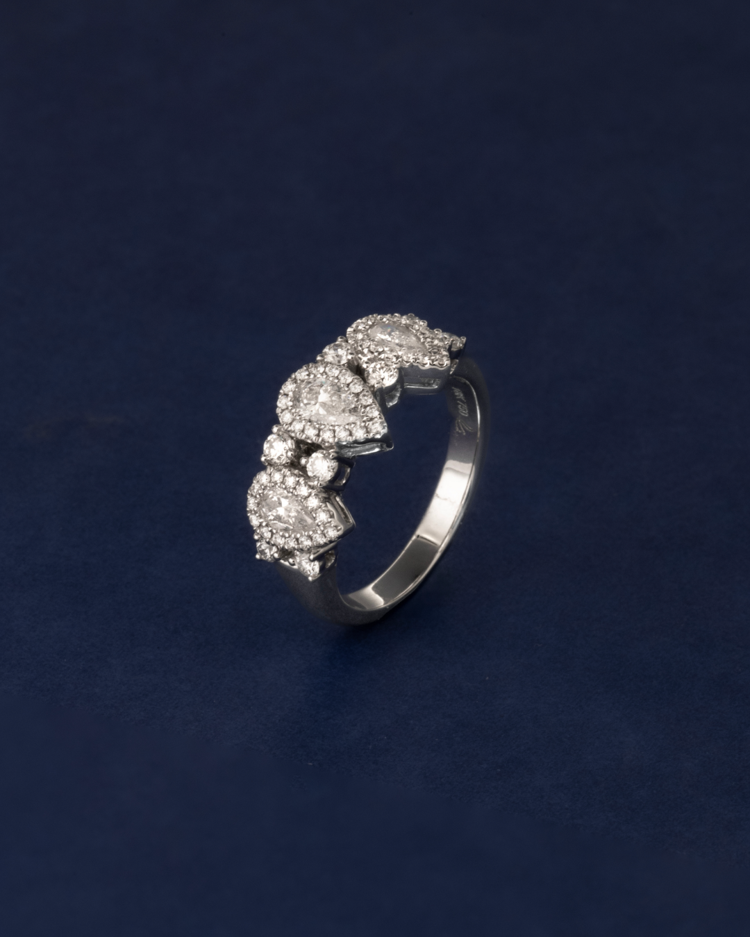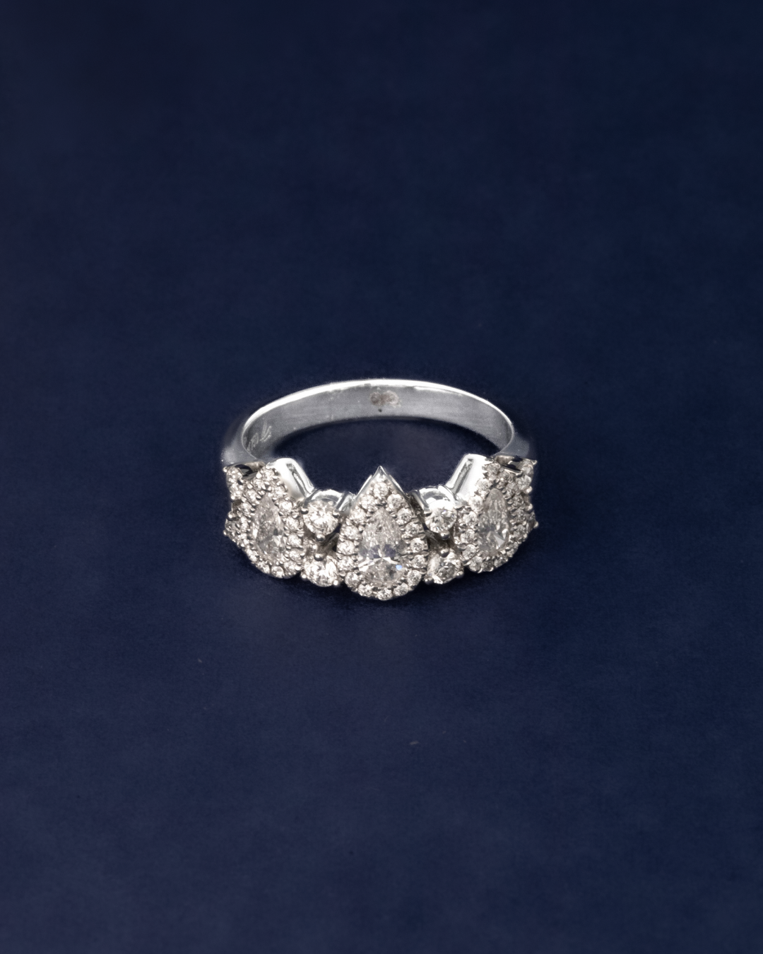 The trio of pear-cut diamonds forms a soft, luminous focal point, while a halo of meticulously set round diamonds enhances the sparkle with refined brilliance. Delicate yet striking, this piece blends classic charm with modern sophistication—perfect for elevating any look with effortless elegance.