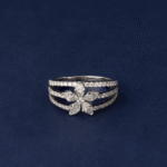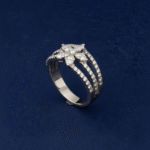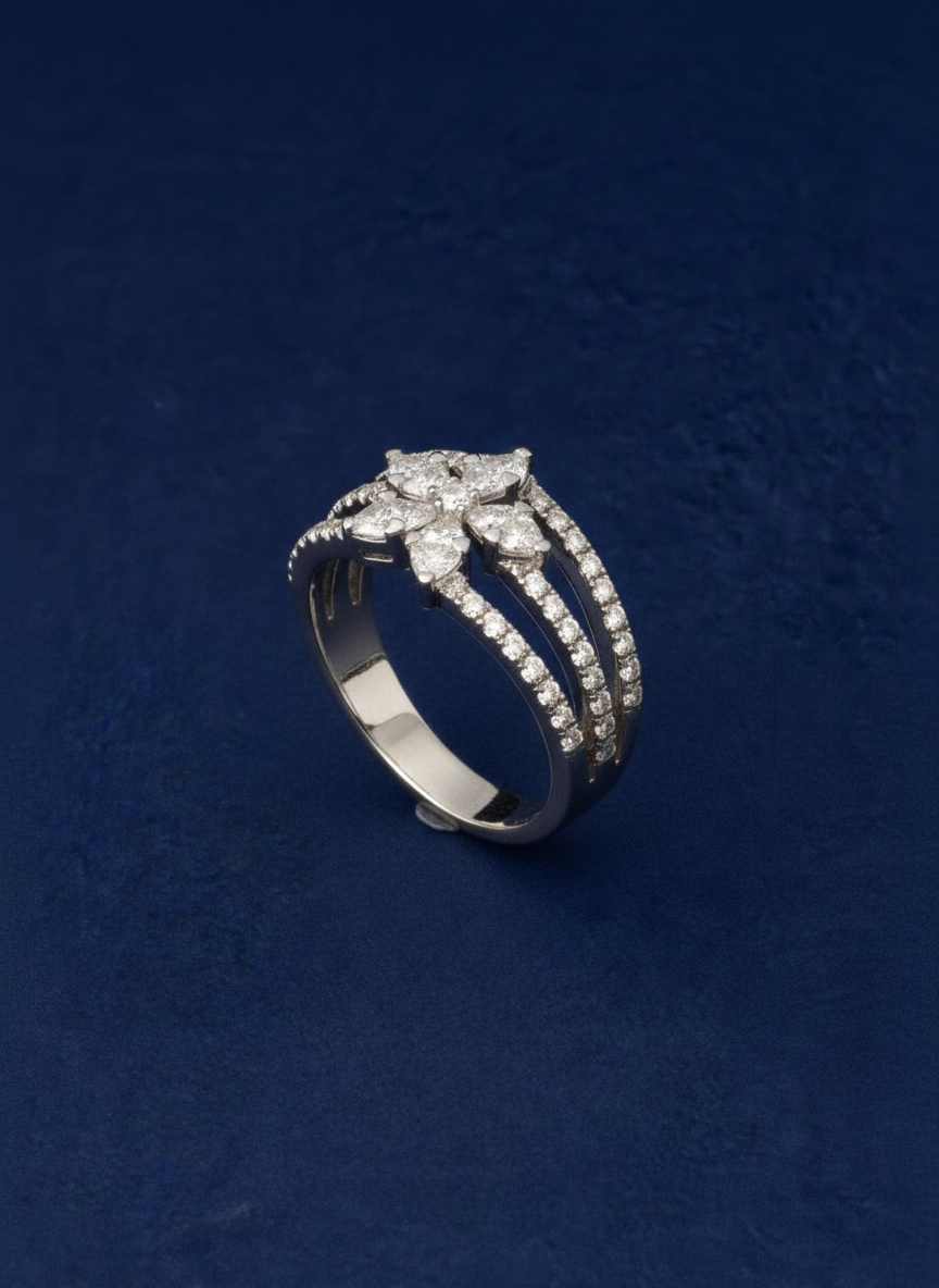 At its center, a rare and captivating triangle-cut diamond commands attention, framed by a delicate halo of round diamonds that enhance its radiance. Modern, sculptural, and undeniably elegant, this piece makes a powerful yet sophisticated statement.