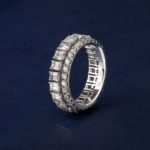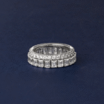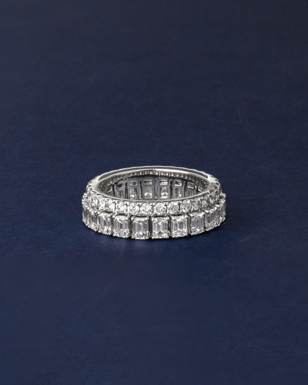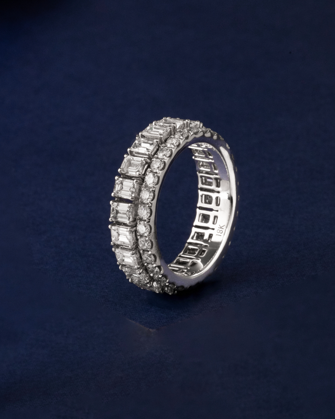 The striking emerald-cut diamonds form the centerpiece, beautifully accented by round-cut diamonds that enhance the sparkle and depth, creating a luxurious ring with timeless elegance and refined sophistication.