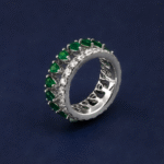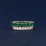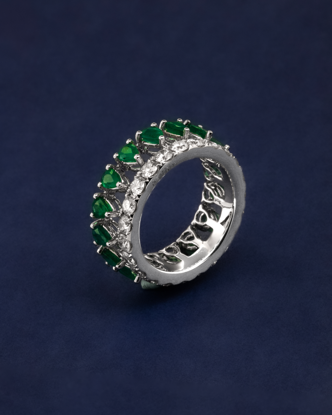 The vivid pear-cut emeralds form a captivating centerpiece, beautifully complemented by the sparkling round-cut diamonds, creating a harmonious balance of color and radiance in a sophisticated and timeless design.