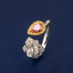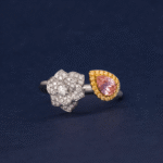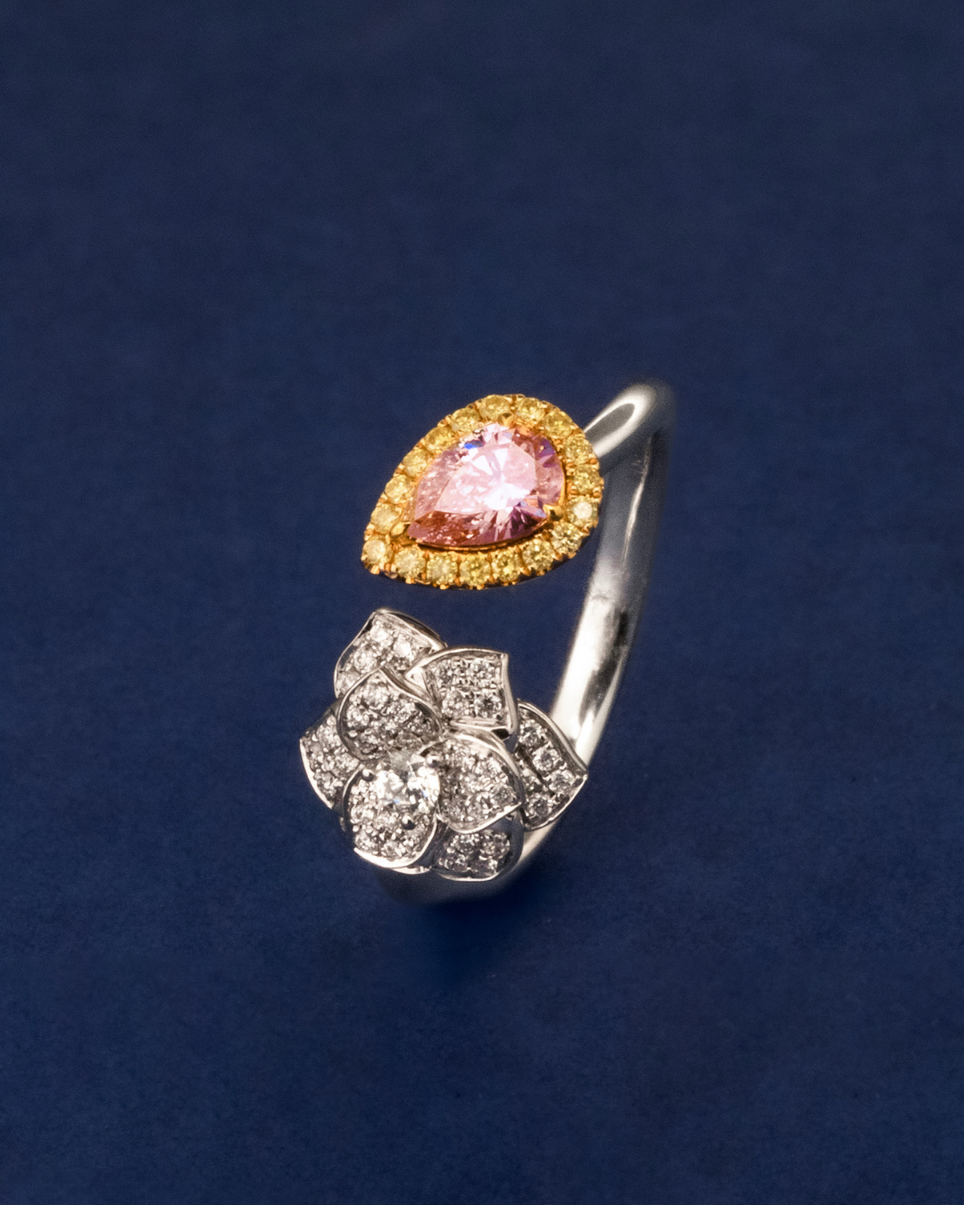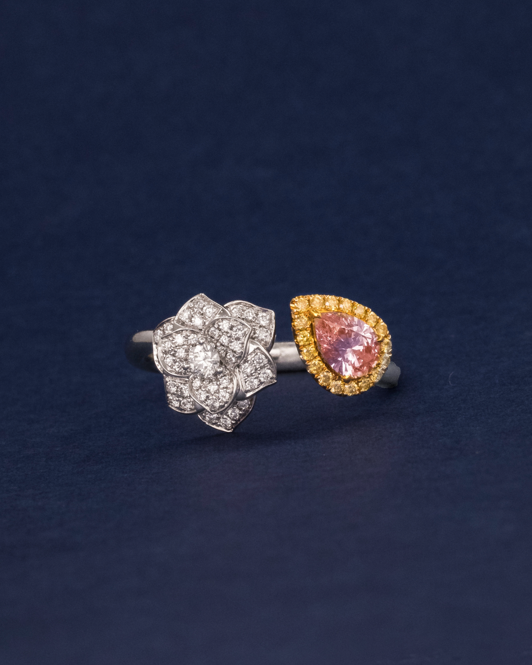 A striking pink pear-cut diamond serves as the centerpiece, beautifully accented by a mix of yellow and classic white diamonds, creating a harmonious blend of color and brilliance in a sophisticated design.