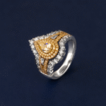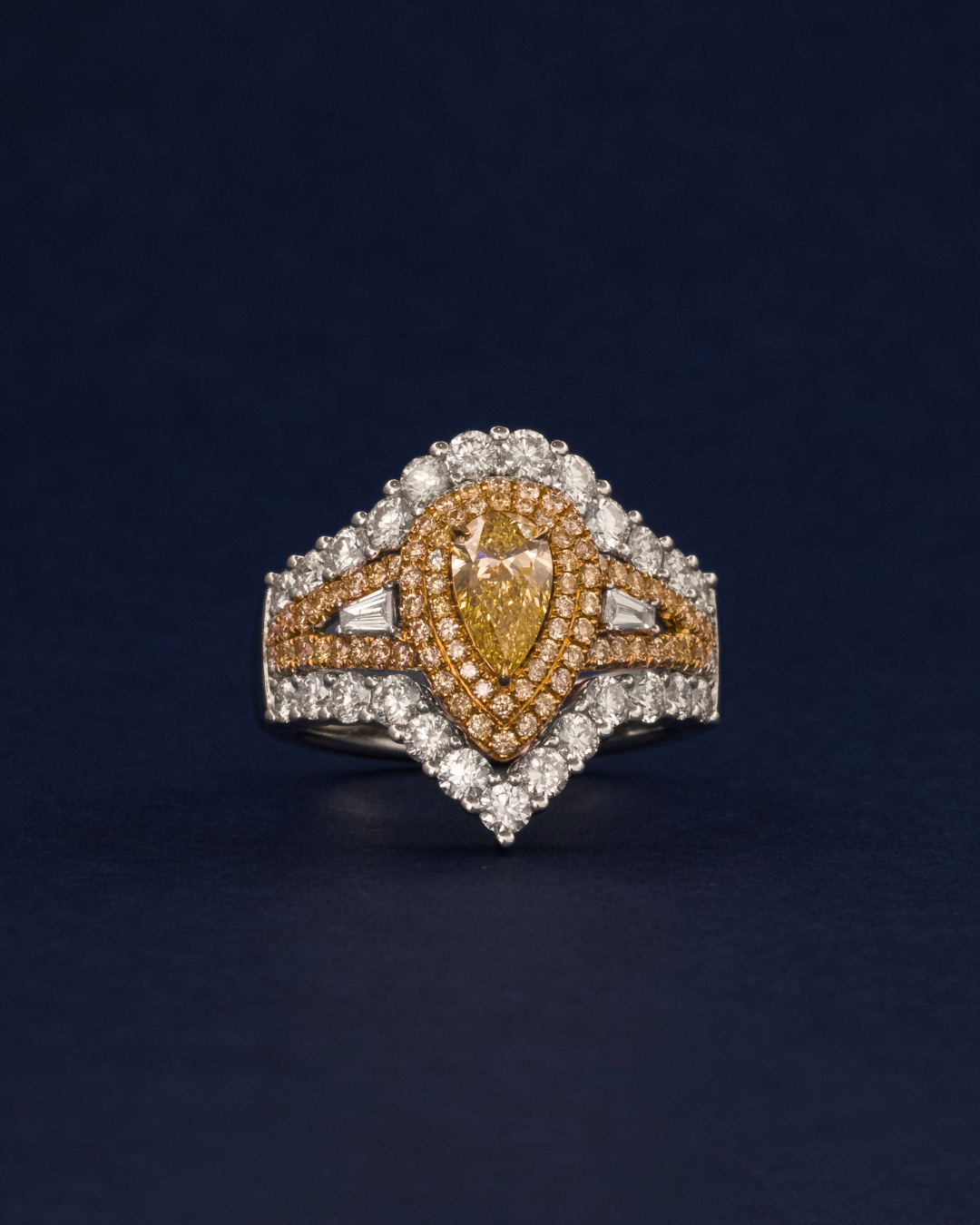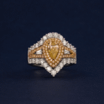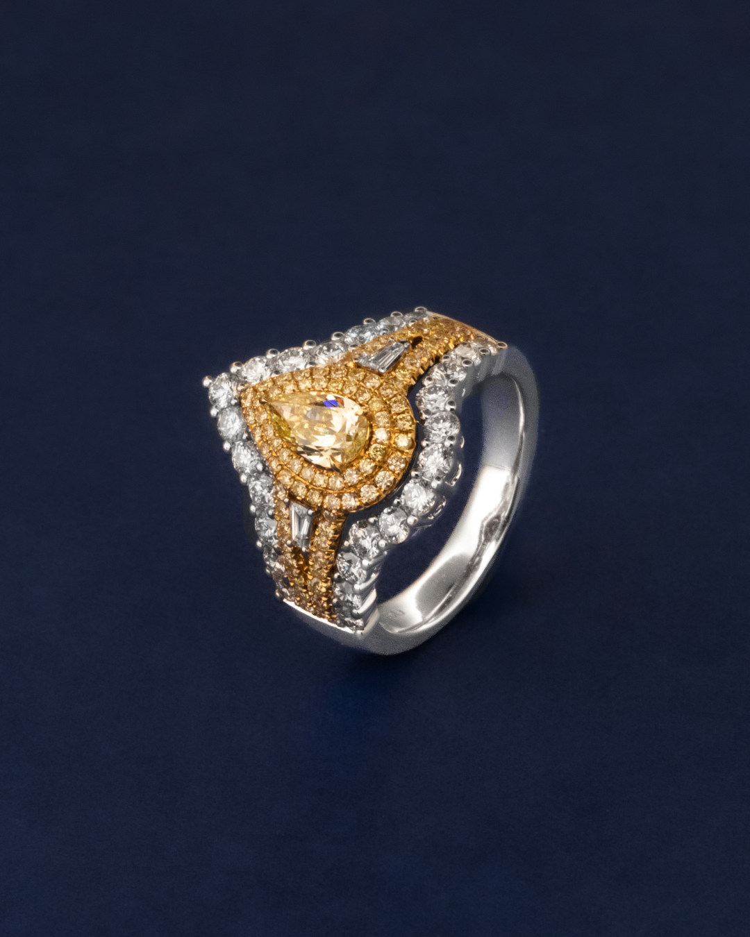 The pear-cut yellow diamond serves as a striking centerpiece, beautifully complemented by a halo of round-cut diamonds, creating a harmonious design that radiates elegance and sophistication.