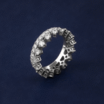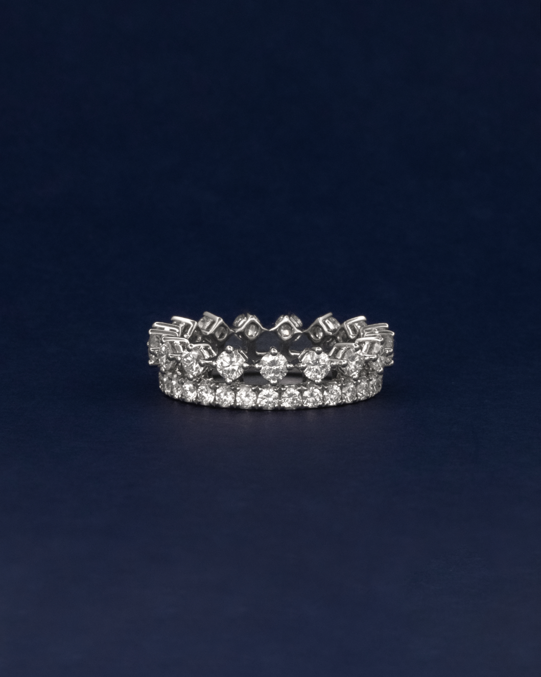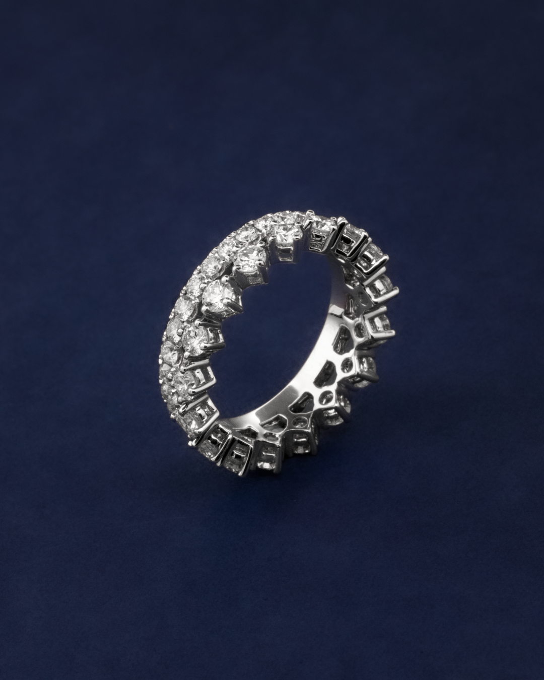 The expertly arranged round-cut diamonds create a continuous shimmer, enhancing the ring’s refined design and delivering a timeless, luxurious appeal.