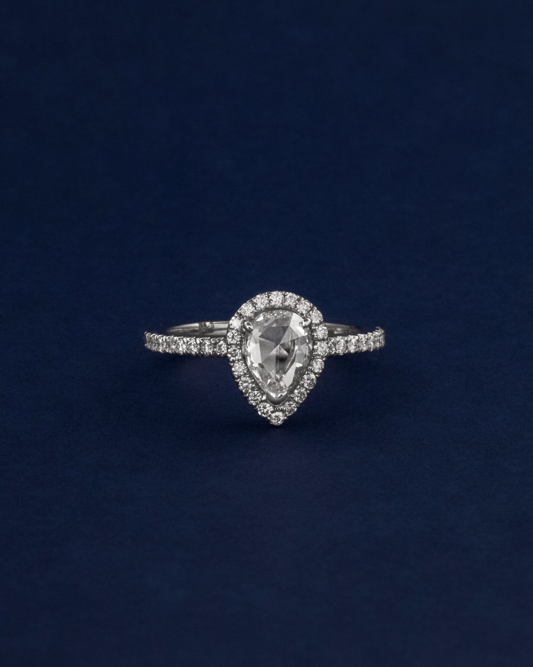 The pear-cut diamond serves as a captivating focal point, enhanced by a halo of meticulously set round-cut diamonds, creating a sophisticated and luminous design that exudes elegance.