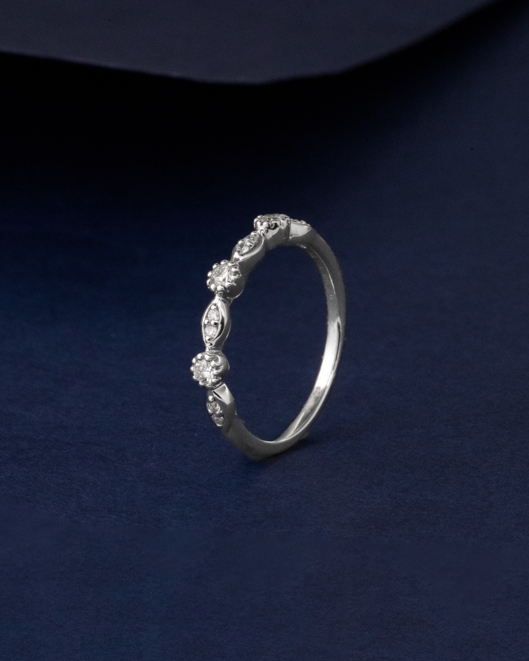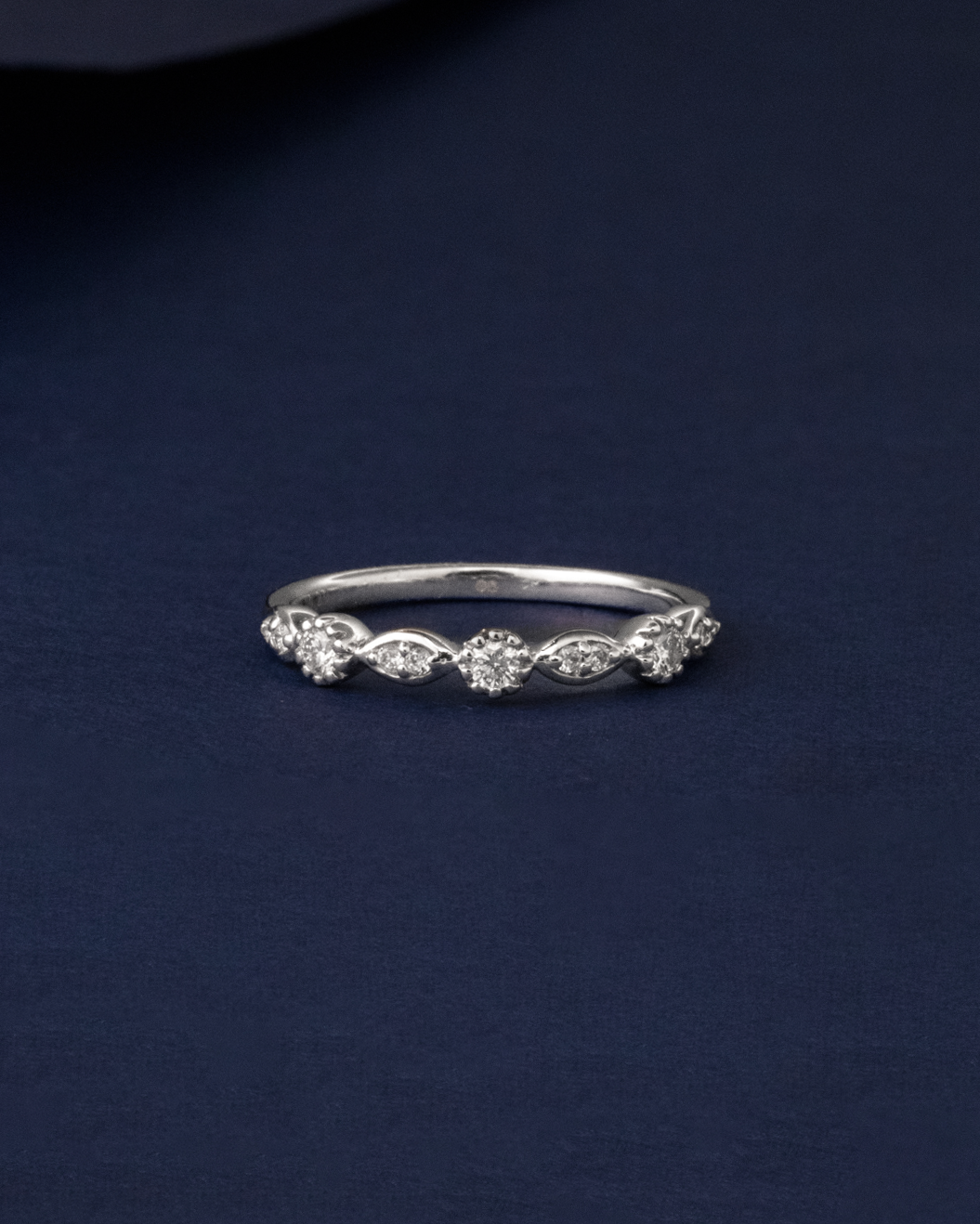 The carefully arranged round-cut diamonds create a delicate shimmer, enhancing the ring’s understated design while providing timeless elegance for any occasion.