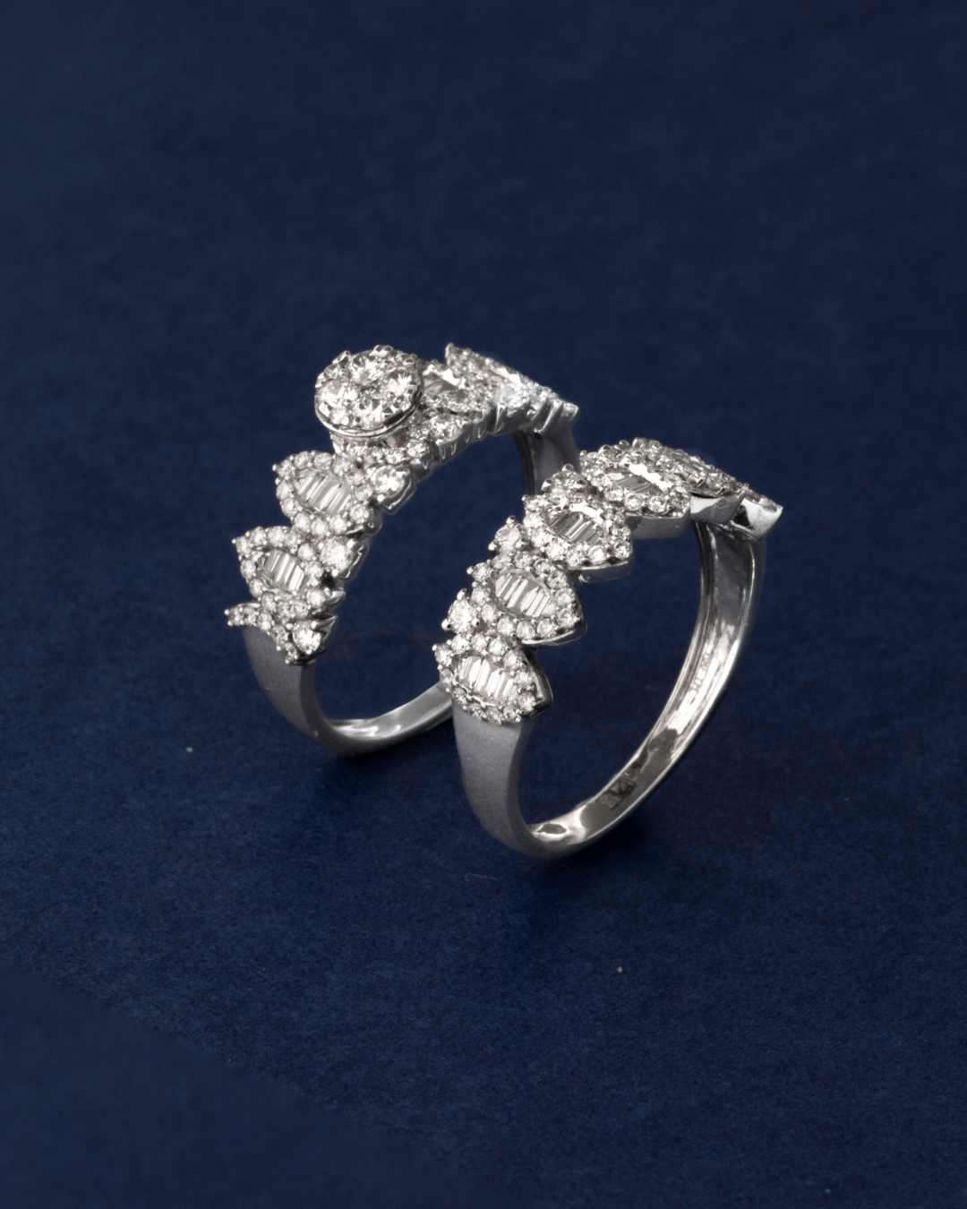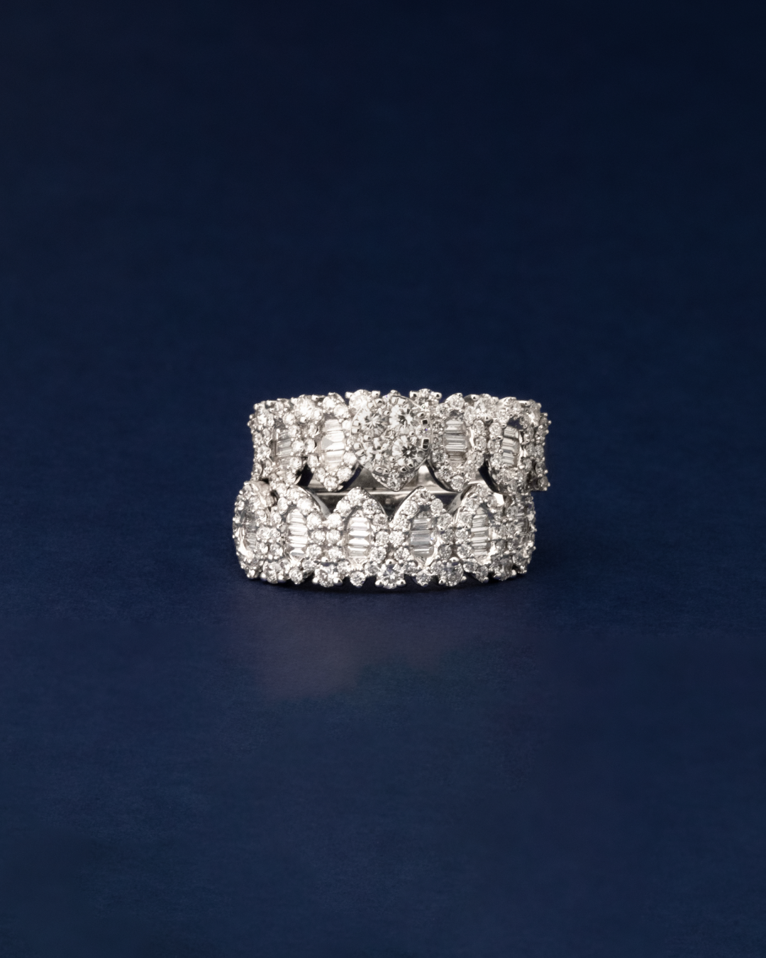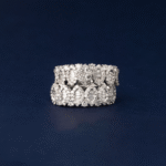 The combination of round and taper-cut diamonds creates a dazzling shimmer across the band, enhancing the ring’s sophisticated design and timeless appeal.