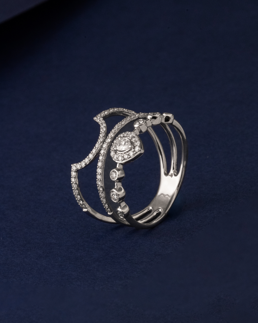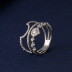 The combination of meticulously set round-cut diamonds creates a subtle shimmer across the band, enhancing the ring’s graceful design and enduring elegance.