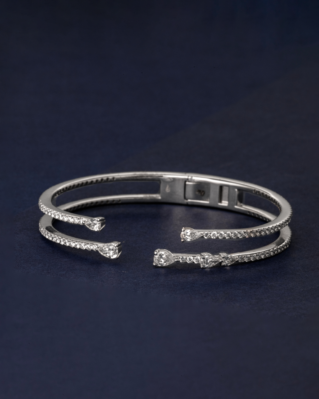 Crafted in 17.41 grams of 18K white gold, this elegant bangle combines the radiant brilliance of round diamonds with the graceful sparkle of pear-shaped diamonds. The harmonious design creates a refined and captivating shimmer, perfect for any occasion.