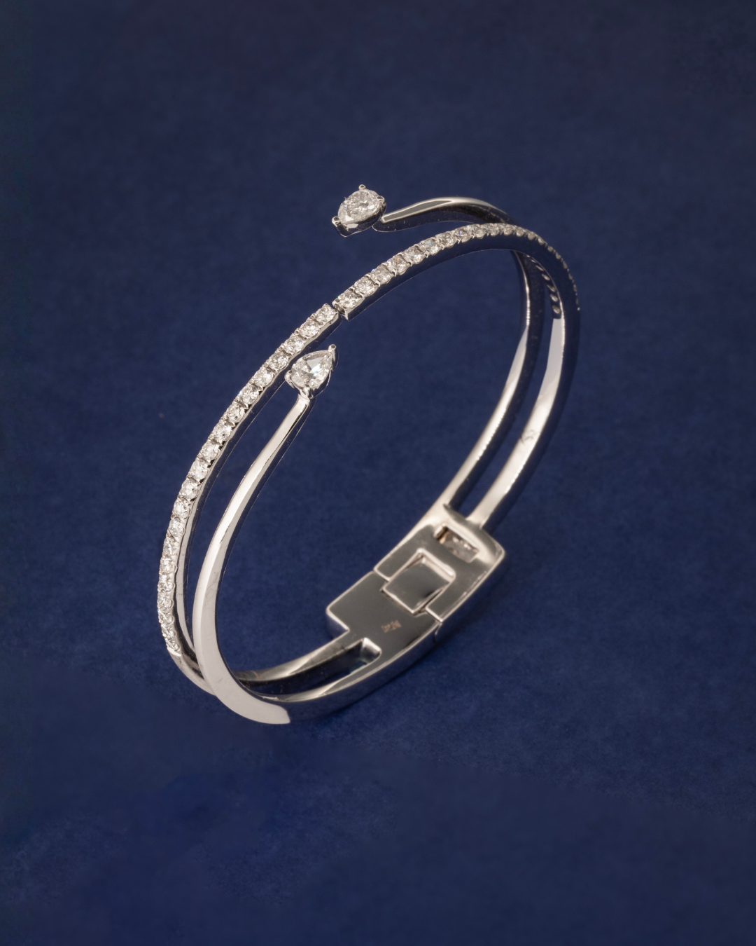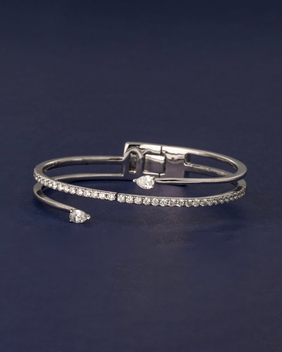 Crafted in 28.62 grams of 18K white gold, this luxurious bangle features a stunning combination of round and pear-shaped diamonds. The elegant arrangement allows each stone to sparkle beautifully, creating a refined and captivating effect.