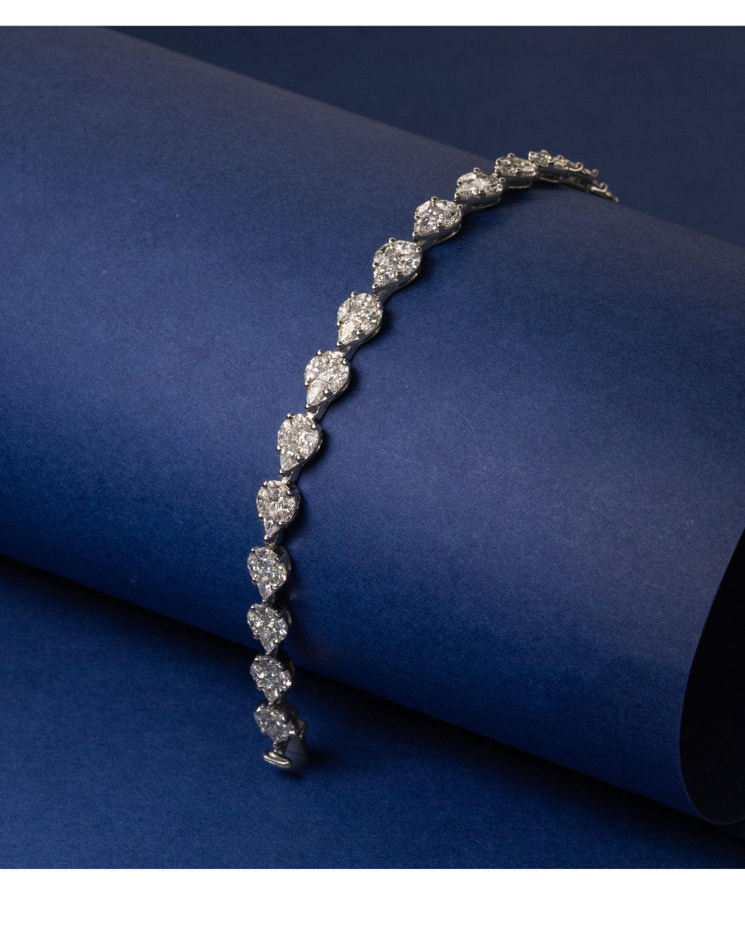 Crafted in 11.23 grams of 18K white gold, this statement bracelet showcases a breathtaking arrangement of mixed diamond cuts, each chosen for maximum brilliance and refined sophistication. The interplay of princess, pear, and marquise diamonds creates a dynamic flow of light, resulting in a piece that feels both luxurious and artistically composed.