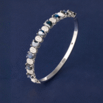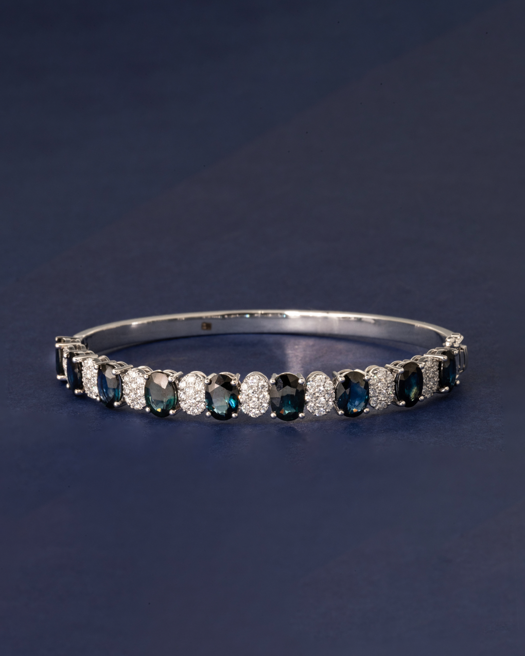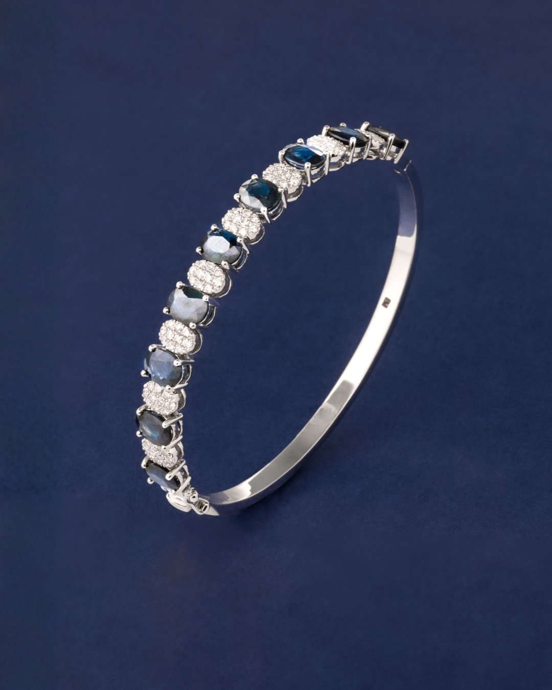 Crafted in 18.94 grams of 18K white gold, this bangle showcases a striking fusion of bold color and refined brilliance. The design pairs the cool gleam of white gold with the vivid allure of blue sapphires, all elevated by a delicate halo of diamonds.
