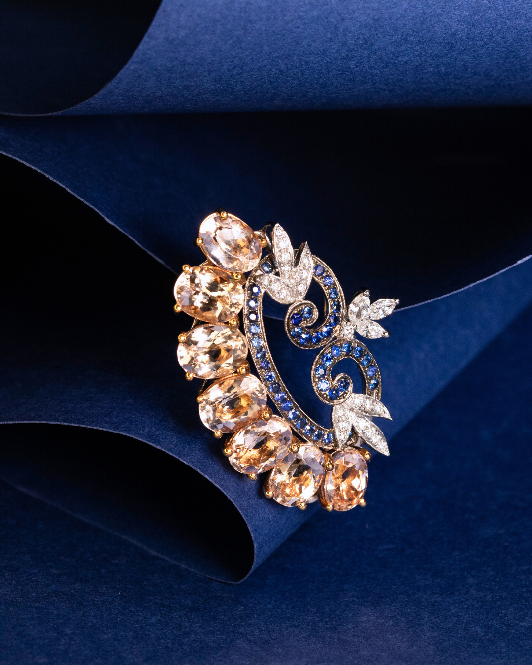 Crafted in 13.1 grams of 18K white gold, this exquisite brooch showcases a vibrant combination of rubies, diamonds, white morganites, and blue sapphires. The interplay of marquise and round diamonds with luminous morganites and vivid sapphires creates a captivating sparkle and a rich, colorful composition.