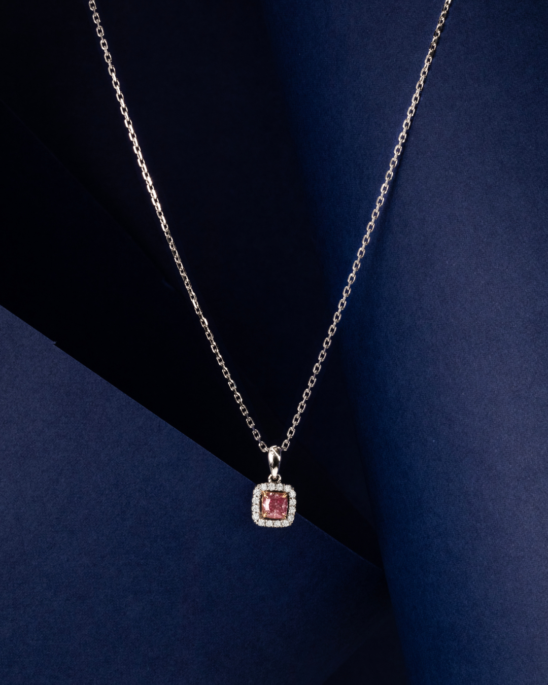 Crafted from 3.02 grams of 18K white and rose gold, this elegant pendant blends modern refinement with a soft, romantic glow. At its center rests a captivating 0.19-carat cushion-cut pink diamond, radiating a gentle blush hue that is beautifully enhanced by the warm rose-gold setting.
